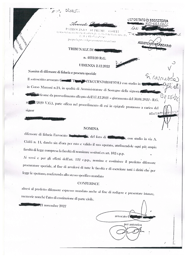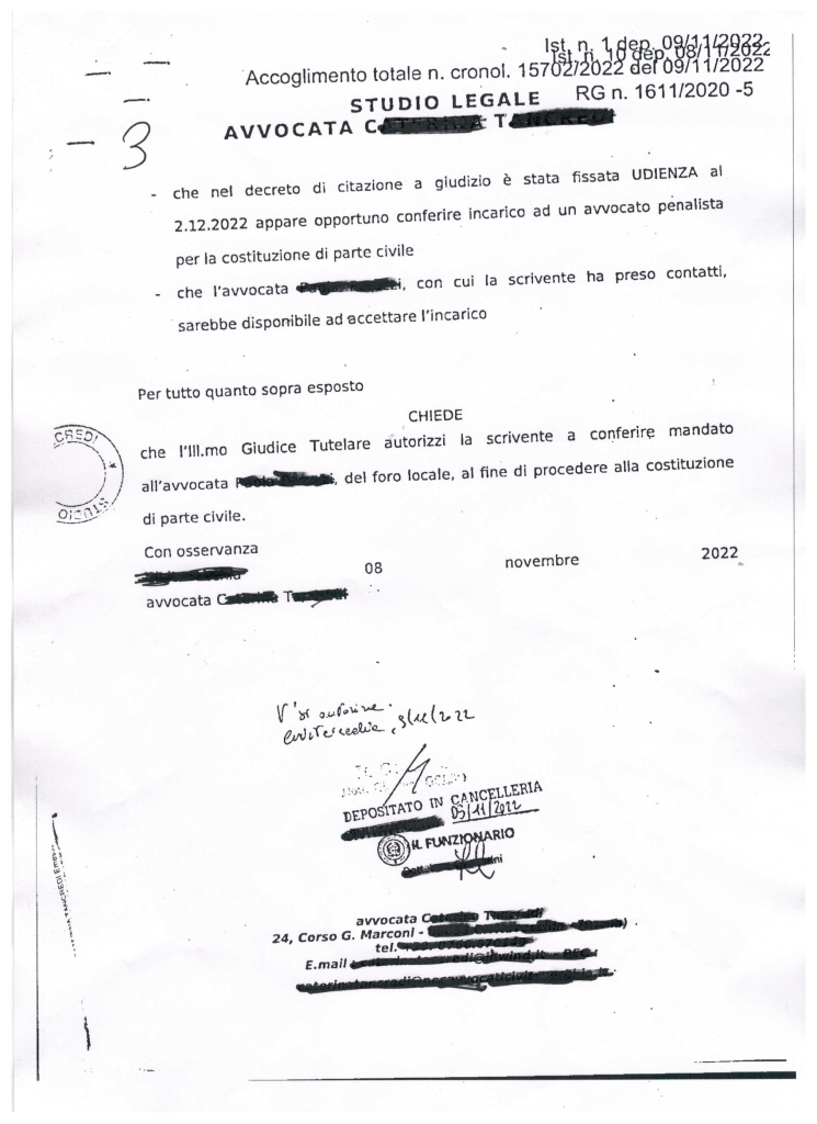Ci è stata fornita la documentazione con la quale l’A.d.S. della sorella, previa autorizzazione del giudice tutelare, si è costituito come parte lesa nel procedimento penale contro il protagonista della vicenda che stiamo narrando. Facciamo notare al lettore soltanto che, a parere di qualche magistrato, il nostro amico, con la denuncia del 16/6/2020, ha detto le bugie ai carabinieri. E’ provato e comprovabile il contrario ma, se così fosse, in quale maniera le presunte bugie potrebbero aver recato dei danni alla sorella? Da manuale del perfetto A.d.S. la frase: “… riscontrate numerose criticità in ordine alla condotta del signor XXXX fratello della beneficiaria ….”. Una locuzione sibillina con la quale, senza dire nulla, si lascia supporre al giudice qualunque cosa esso voglia immaginare. Di seguito mettiamo le relative carte: