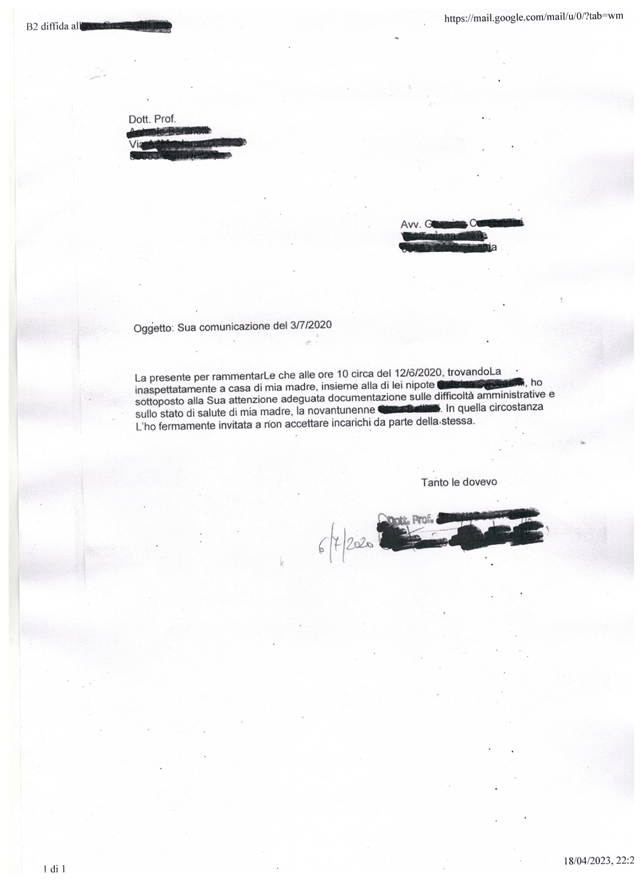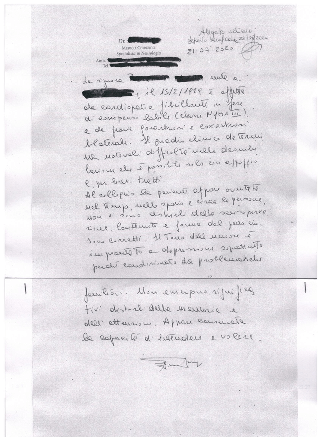 Un’altra novità riguarda la recente visura del fascicolo relativo alla madre deceduta l’11 luglio 2022, sulla cui amministrazione extrafamiliare sta indagando la procura della Repubblica competente. Dal carteggio mancano tanti documenti. Per la precisione risultano smarriti: quattro certificati medici; due richieste di visite mediche specialistiche; l’istanza in forma libera dell’istante fatta al G.T. per chiedere la nomina quale A.d.S. di XXXX del 15/6/2020; la comunicazione inviata all’istante dall’avv. C. G. del 29/6/2020; la diffida scritta dall’istante all’avv. C. G. del 6/7/2020; la replica dell’avv. G.C. del 9/7/2020; la procura speciale firmata dalla vecchia disabile per l’avv. C. G. del 22/7/2020; la memoria dell’istante con allegati depositata per l’udienza del 27/7/2020; l’email scritta dall’istante al Dr. XXXX il 31/7/2020; la cronologia dei fatti fornita dall’istante ai C.C. su richiesta del maresciallo XXXX del 3/8/2020; la memoria dell’istante con allegati depositata per l’udienza del 28/9/2020; il memorandum di un prelevo effettuato su un libretto postale cointestato; la richiesta dell’istante con contestuale consegna delle copie per il reclamo in Corte d’Appello dell’8/1/2021. Non ci sembra utile ripubblicare oggi tutti i documenti mancanti dal fascicolo, del resto sono stati già precedentemente riportati nel corso del nostro racconto. Ci limitiamo a riprodurre quelli di seguito. Ci appare degna di sottolineatura la disarmonia tra il certificato obiettivo dell’11/6/2020 (qui non riprodotto), le iniziali richieste di visite specialistiche da parte del medico ed il certificato redatto dallo stesso il mese successivo, esattamente il giorno antecedente alla firma della disabile per conferire una procura speciale all’avvocato C.G..