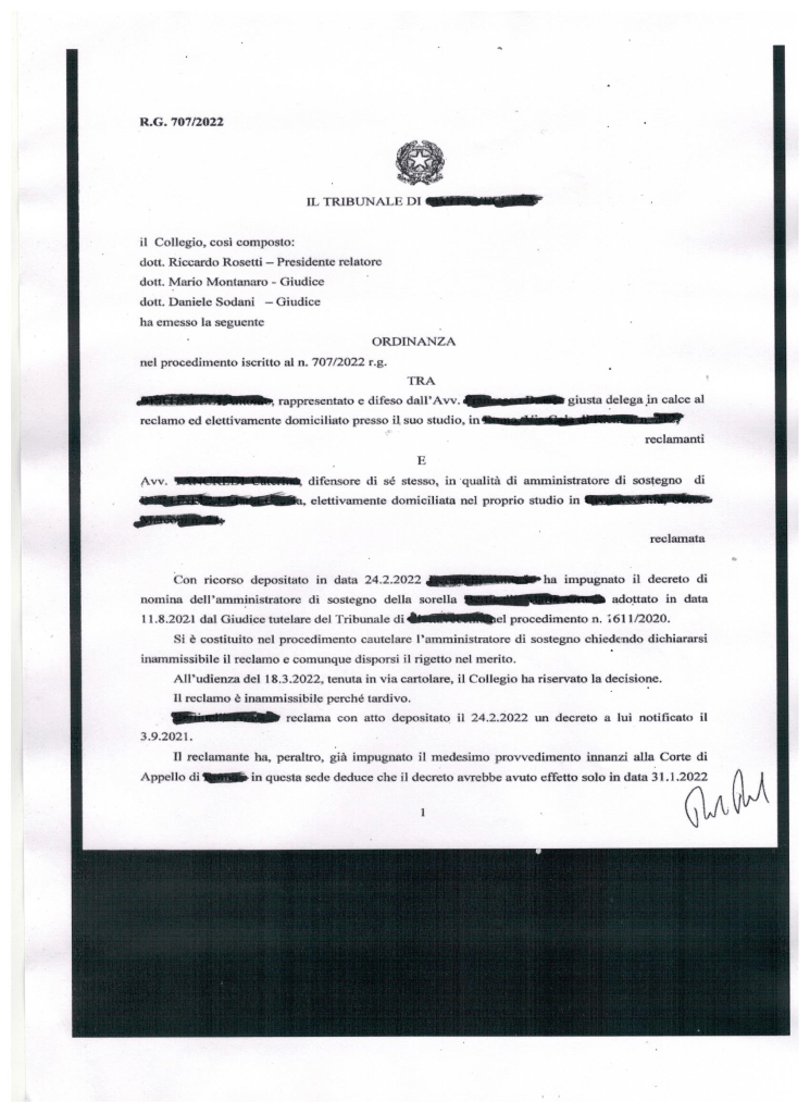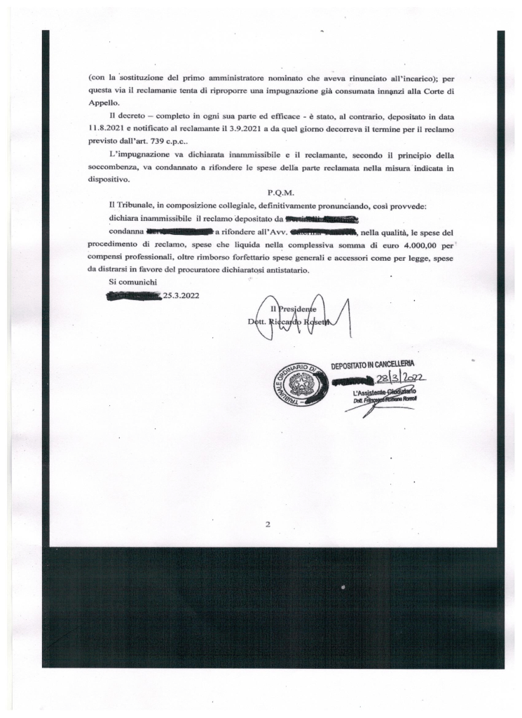 Tale “estensione” d’incarico, e non già la nomina di data antecedente (all’epoca reclamata in Corte d’Appello), è stata contestata, attraverso un reclamo “dilatorio” in tribunale, nei termini previsti (8 febbraio 2022). (riportato sulle puntate n. 139 ter e 139 quater)