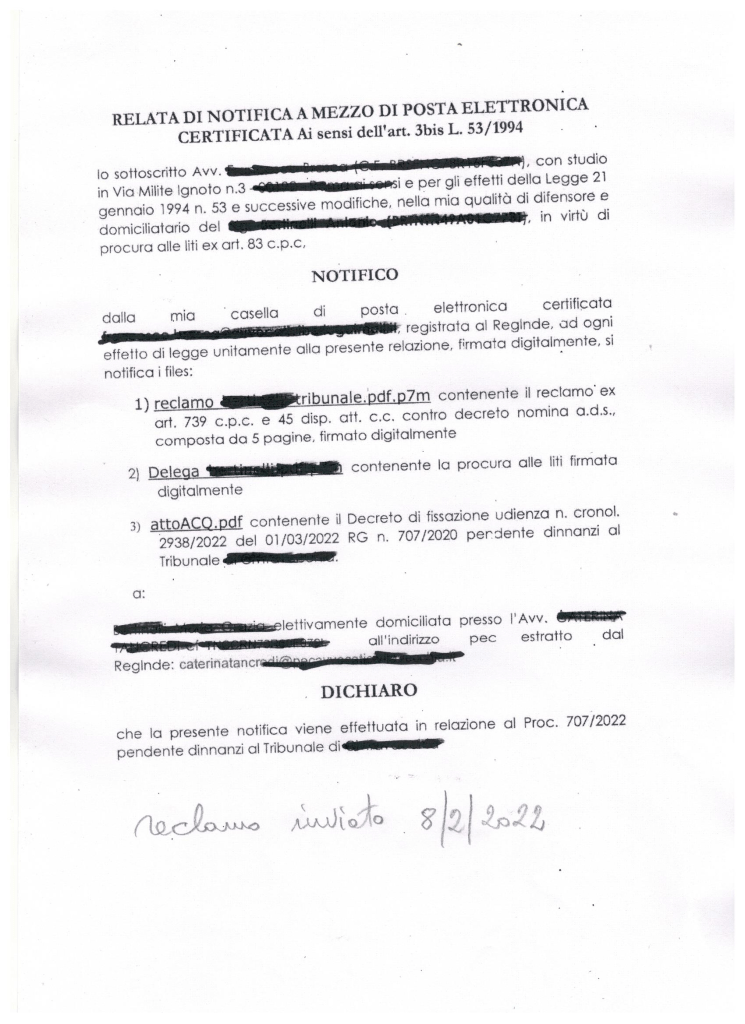 Tale “estensione” d’incarico, e non già la nomina di data antecedente (all’epoca reclamata in Corte d’Appello), è stata contestata, attraverso un reclamo “dilatorio” in tribunale, nei termini previsti (8 febbraio 2022). (riportato sulle puntate n. 139 ter e 139 quater)