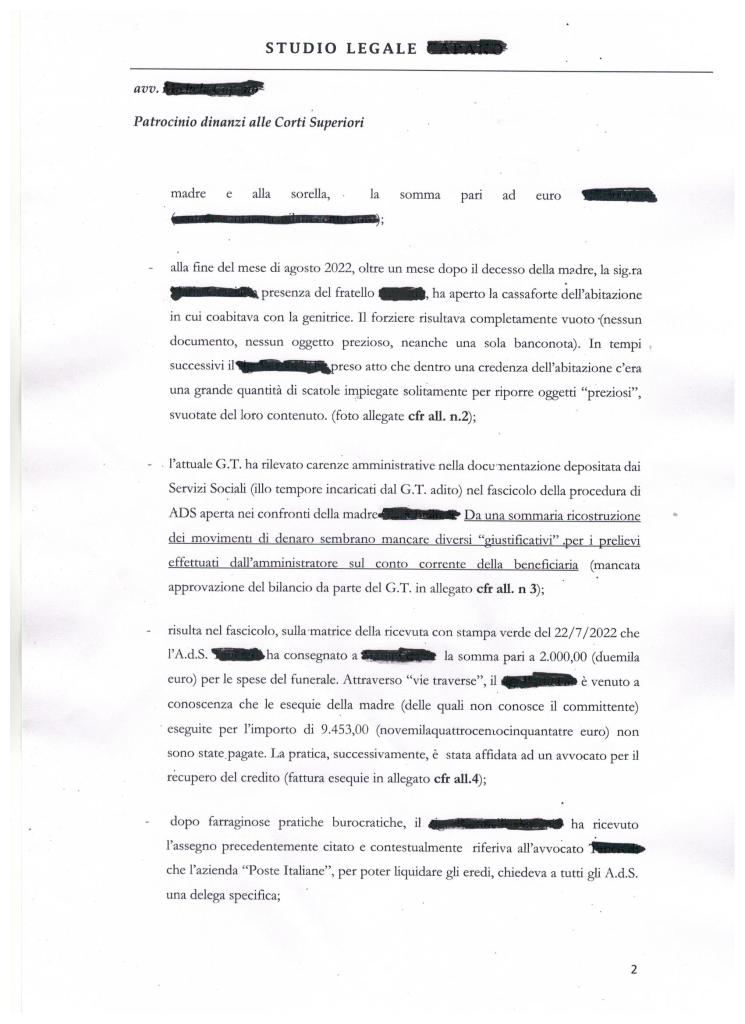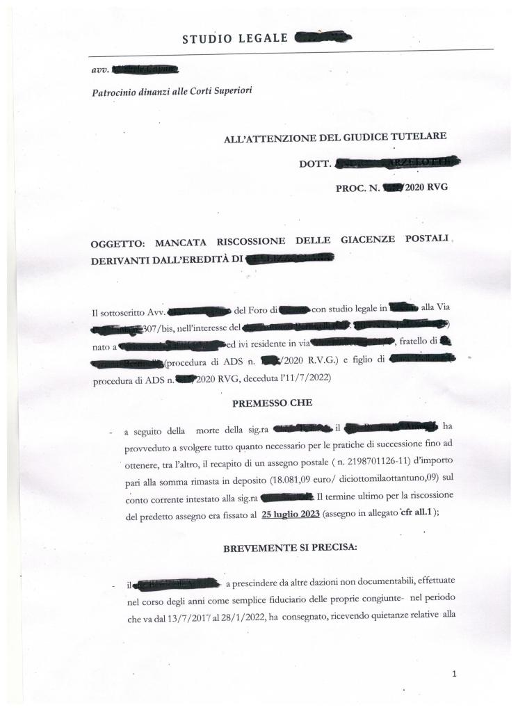 Di seguito mettiamo la richiesta fatta al G.T. dall’avvocato dell’erede per affrontare questa nuova e del tutto imprevista difficoltà.