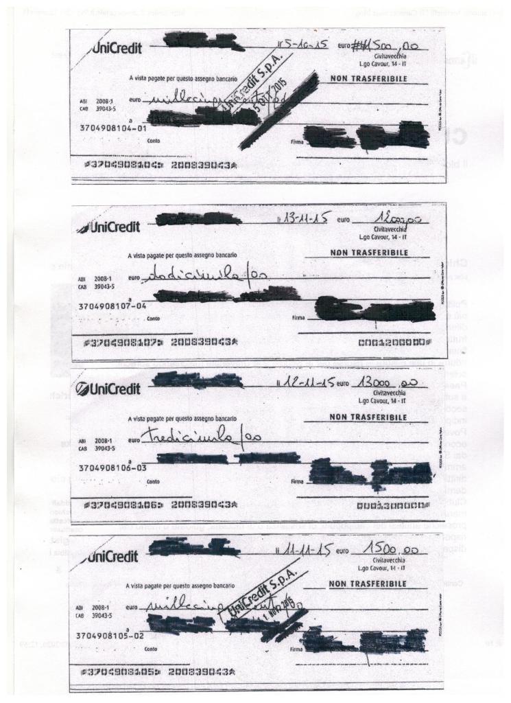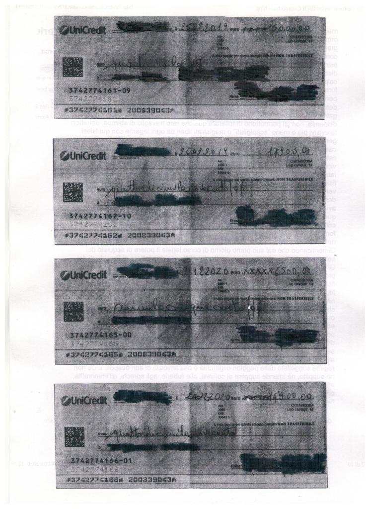 Torniamo al consueto reportage riportando qualche elemento nuovo, seppure marginale rispetto a tutto il resto. Il nostro amico è in possesso delle copie del fascicolo inerente l’amministrazione di sostegno della propria congiunta da parte di un avvocato (quelle che ha ritirato prima dell’ultima “secretazione”). Ha così potuto constatare che detto amministratore ha fornito al G.T. le copie di tutti gli assegni da lui firmati e riscossi nella veste di procuratore generale della sorella, dal 2015 in poi. Ricordiamo al lettore che il procuratore non aveva limiti di mandato nel movimentare denaro sul conto bancario e per conto della donna. Dunque a cosa dovrebbero servire queste copie senza i movimenti in accredito, questi, tra l’altro, riportati nel faldone delle indagini penali? Ad insinuare dubbi? Notiamo che l’A.d.S. non si è peritato di fornire al G.T. le copie di queste operazioni sul conto corrente della beneficiata da parte del fratello (neanche una), né ha avvertito la necessità di segnalare le rilevanti e plurime dazioni di denaro dello stesso alla donna. Queste dazioni quietanzate, illo tempore, erano state anche riferite da uno degli avvocati del reclamante all’A.d.S., che quindi ne era a conoscenza, se non totalmente, quanto meno in misura significativa. Mettiamo di seguito le scansioni degli assegni emessi a prelievo, le uniche che l’avvocato C.T. ha ritenuto opportuno di depositare nel fascicolo citato. Magari Barbara Pavarotti, nel corso delle sue instancabili ed accurate indagini sulle ricadute effettive della legge n. 6/2004, potrebbe provare a chiedere lumi sulle strategie che adottano usualmente gli amministratori di sostegno esogeni all’avvocato Paolo Cendon.