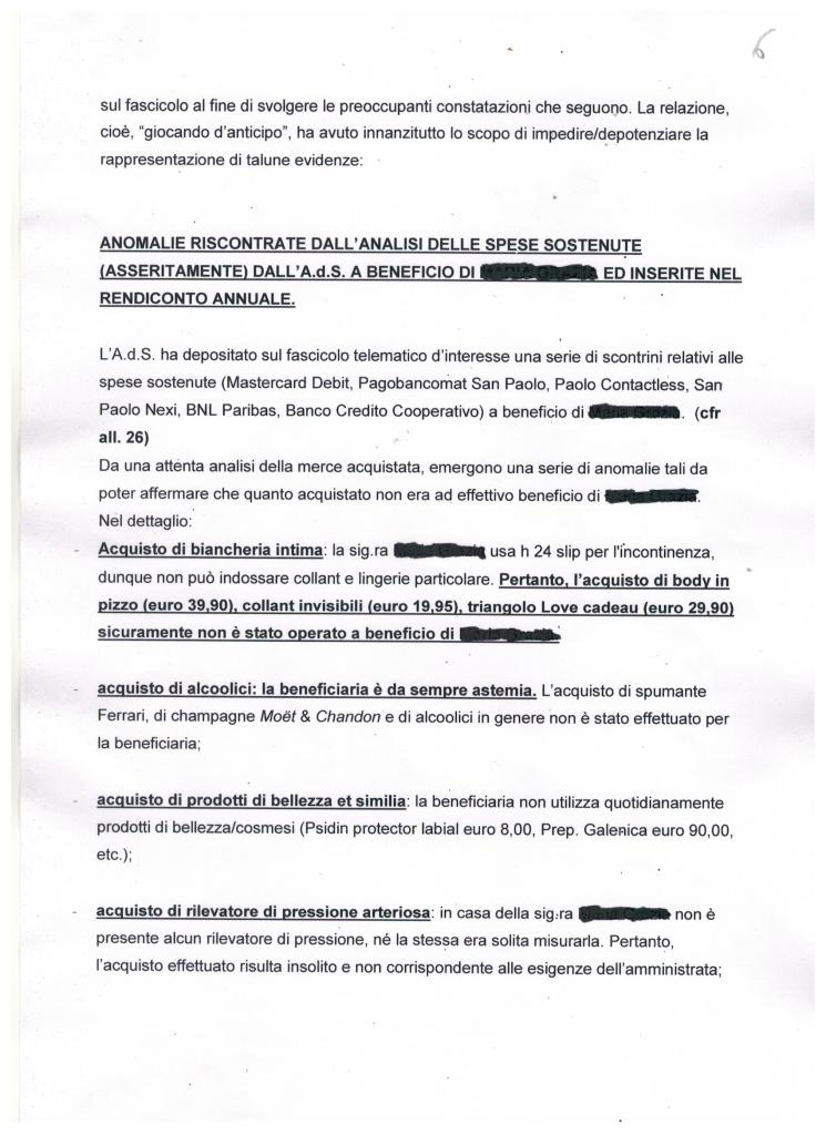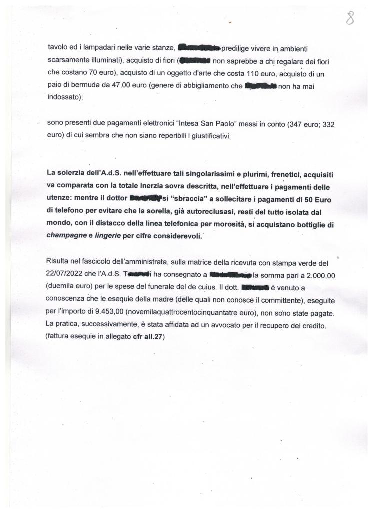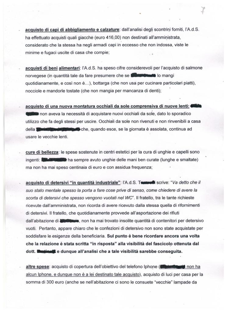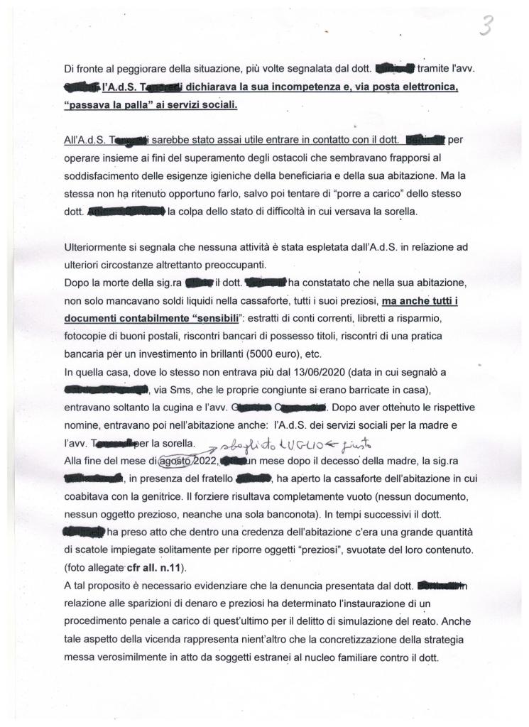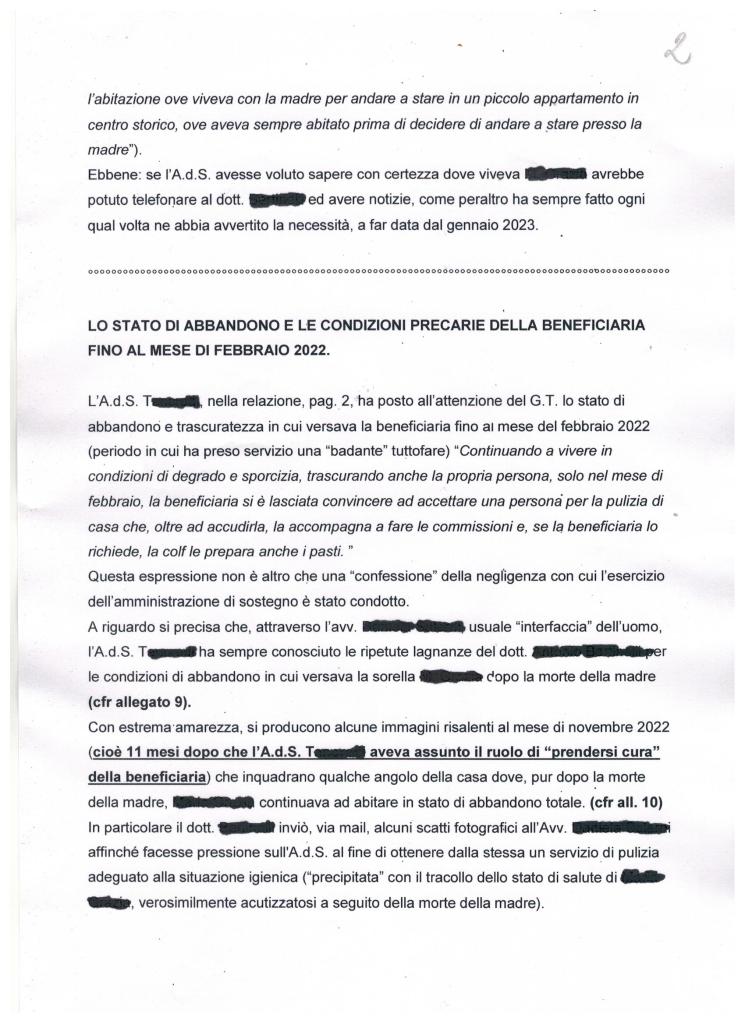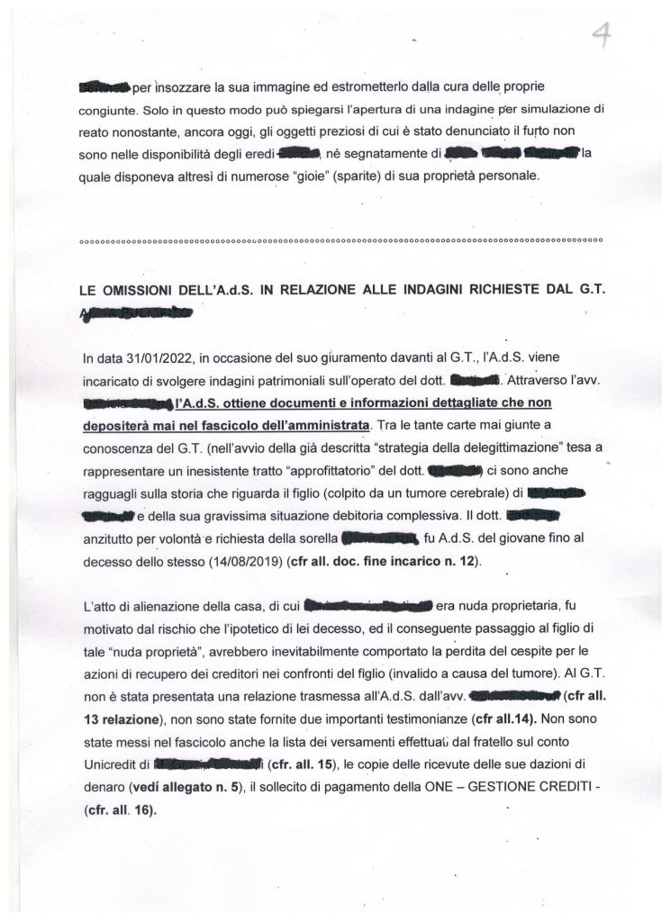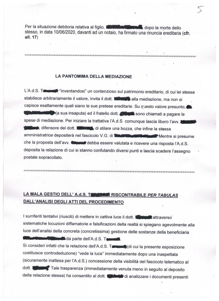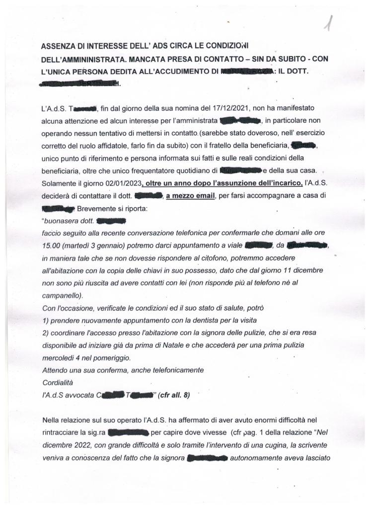Non vogliamo abusare della pazienza del lettore e passiamo alla nostra consueta narrazione con un aggiornamento. Dopo aver ricevuto la notifica relativa alle nuove accuse il nostro amico ha deciso di replicare. Sa bene che il sistema mette a disposizione dei suoi più “coriacei oppositori”, quasi sempre sepolti sotto una raffica di azioni penali ad hoc, ben poche e poco affilate armi da difesa. Il presunto reo (non privo tuttavia di altri piani) ha depositato una memoria estremamente dettagliata in 35 pagine e documentata con 30 scansioni di molteplici documenti. Abbiamo scelto otto pagine delle trentacinque (quelle che ci sono sembrate più rappresentative del consuetudinario sistema riguardante gli A.d.S. esogeni) e le abbiamo riportate di seguito. Abbiamo l’impressione che una considerevole parte delle toghe non abbia più a cuore la massima credibilità di cui necessita la categoria in quanto potere della Repubblica italiana. I giudici tutelari (non di rado) secretano i fascicoli. In tal modo favoriscono le calunnie, le diffamazioni ed il malaffare ad opera degli amministratori di sostegno extrafamiliari. Questi incaricati (una specie di ufficiali giudiziari) sono di solito condiscendenti e molto tolleranti nei confronti delle diffuse carenze degli enti pubblici. Anche per tale motivo non si trova mai qualcuno che eccepisca sul macroscopico conflitto d’interesse: chi infanga le reputazioni altrui per mestiere, più infanga e meglio si garantisce una rendita parassitaria a spese dell’amministrato e/o dei suoi familiari (questi ultimi frequentemente “ammorbiditi” con minacce, ricatti, esposti ai servizi sociali e denunce alle procure della Repubblica).