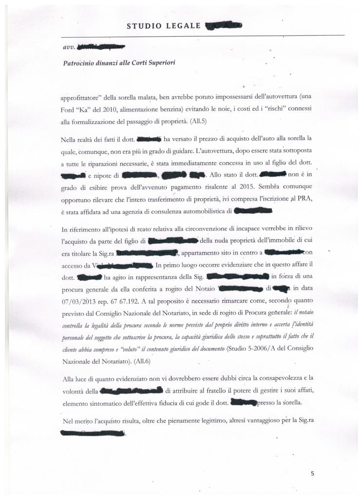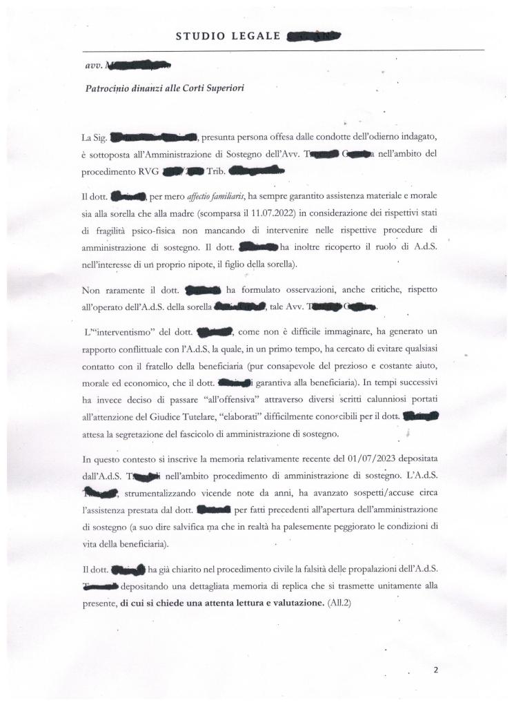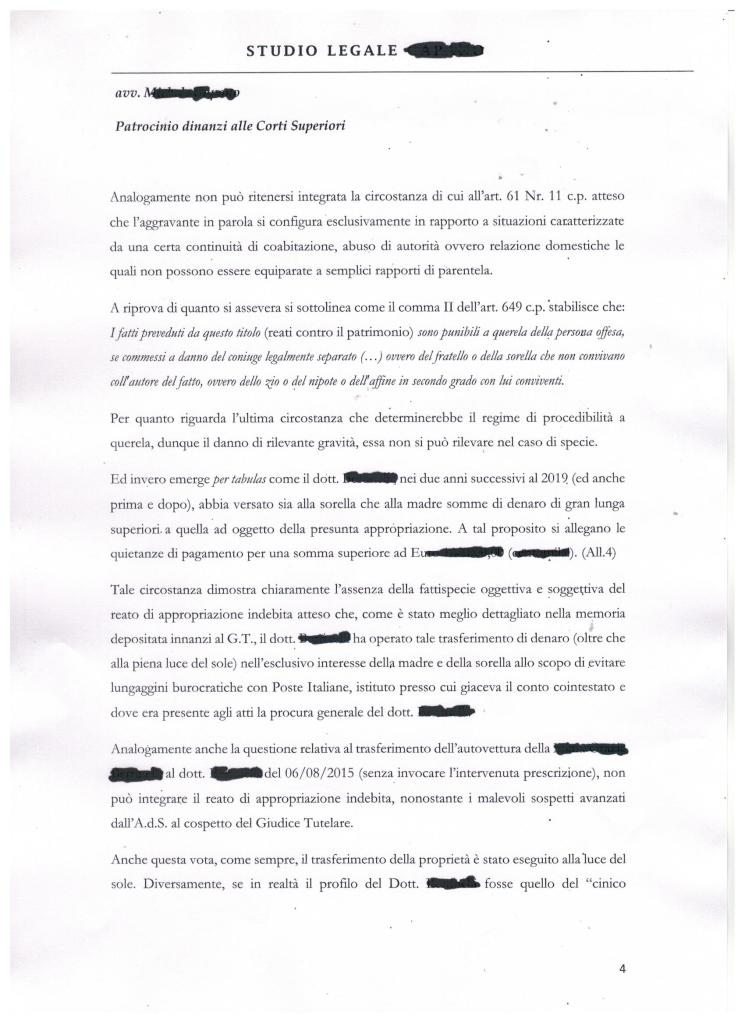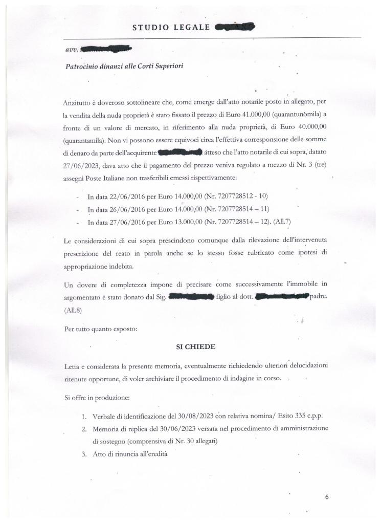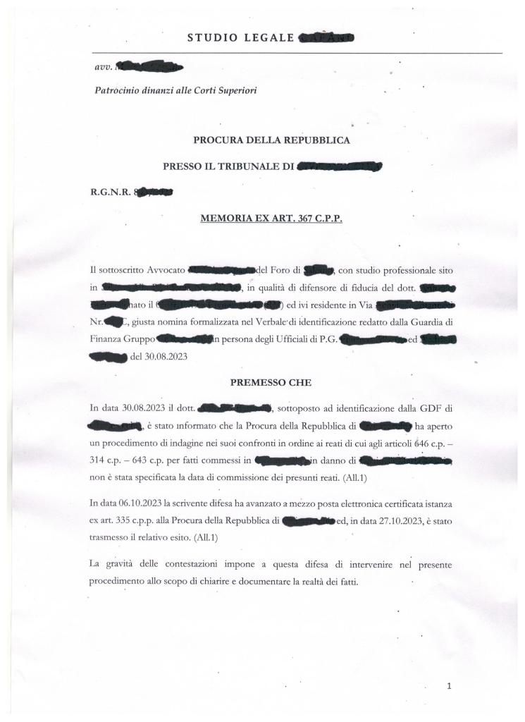 Non ci dilunghiamo ancora sulle vecchissime solite dolenti note e riprendiamo la narrazione relativa all’Odissea del nostro amico che, per giunta, dopo quattro anni di inenarrabili afflizioni, deve fronteggiare un nuovo assalto giudiziario “penale”, ora artatamente potenziato. Qualche giorno fa ha depositato una memoria a sua difesa. Nello scritto indirizzato alla procura della Repubblica non si indulge ad altro e si affrontano solo stringenti argomentazioni giuridiche. C’ è una data (27/06/ 2023) con un refuso (andava scritto 27/06/2016) ma comunque ecco la sua copia integrale: