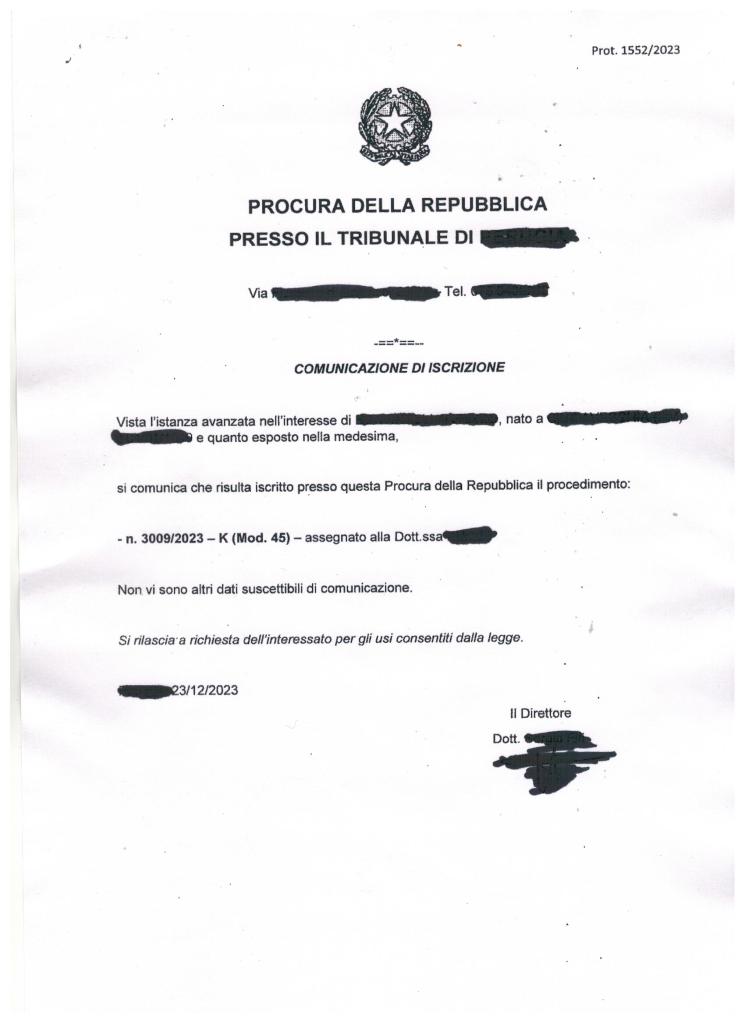 Il nostro amico, il 13/10/2023, ai sensi della legge n. 420/1998 ha depositato un atto di denuncia di venti pagine con diciannove allegati. Di seguito riscriviamo soltanto l’ultima pagina dell’atto citato a cui poi faremo seguire la copia della risposta fornita alla richiesta della certificazione ex art. 335 c.p.p.