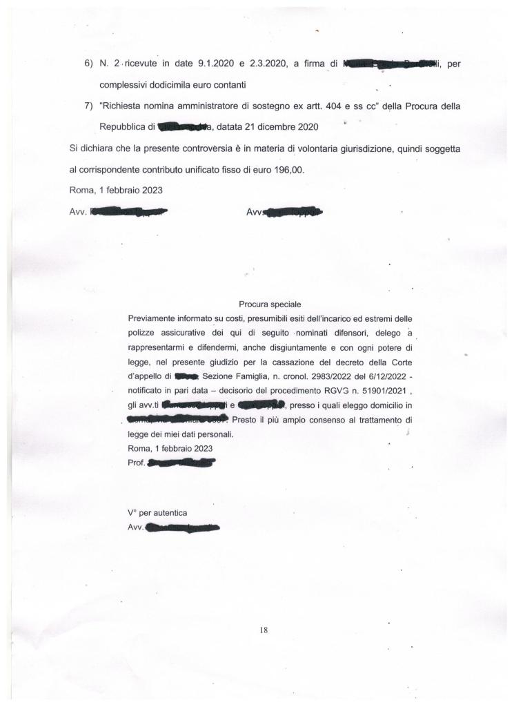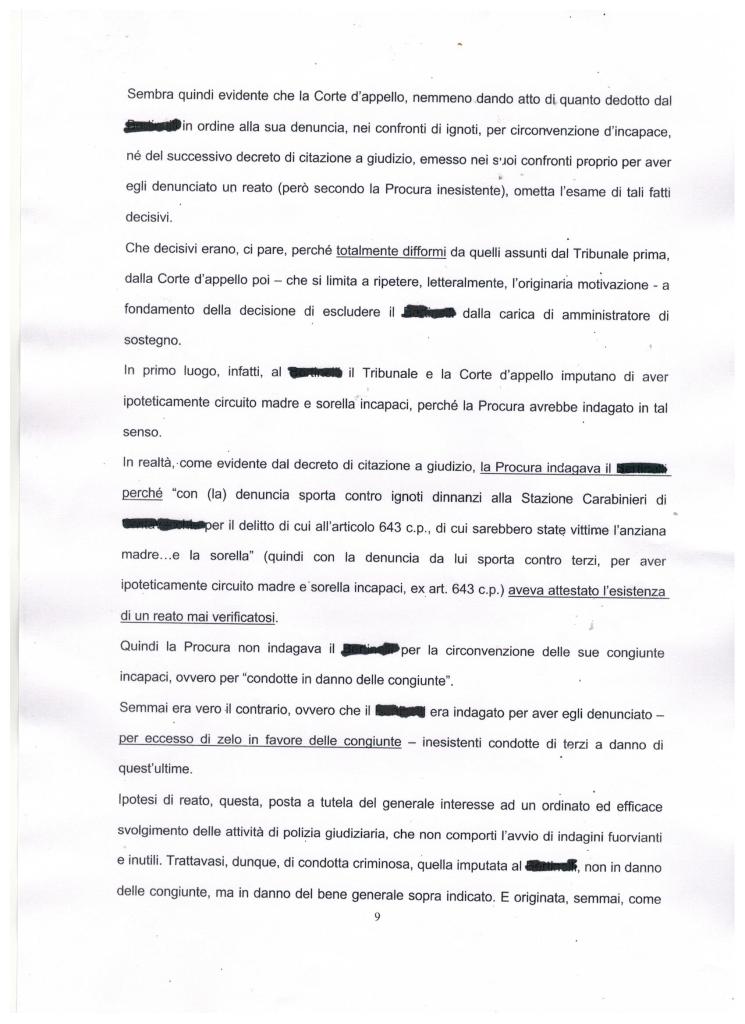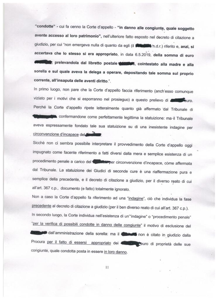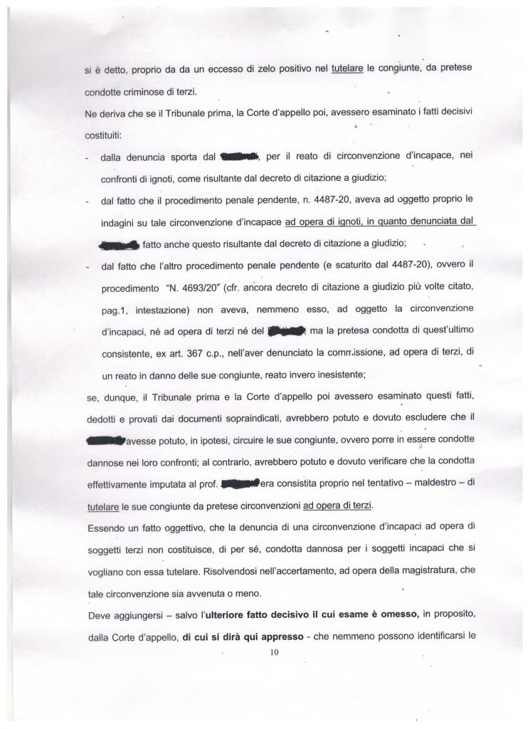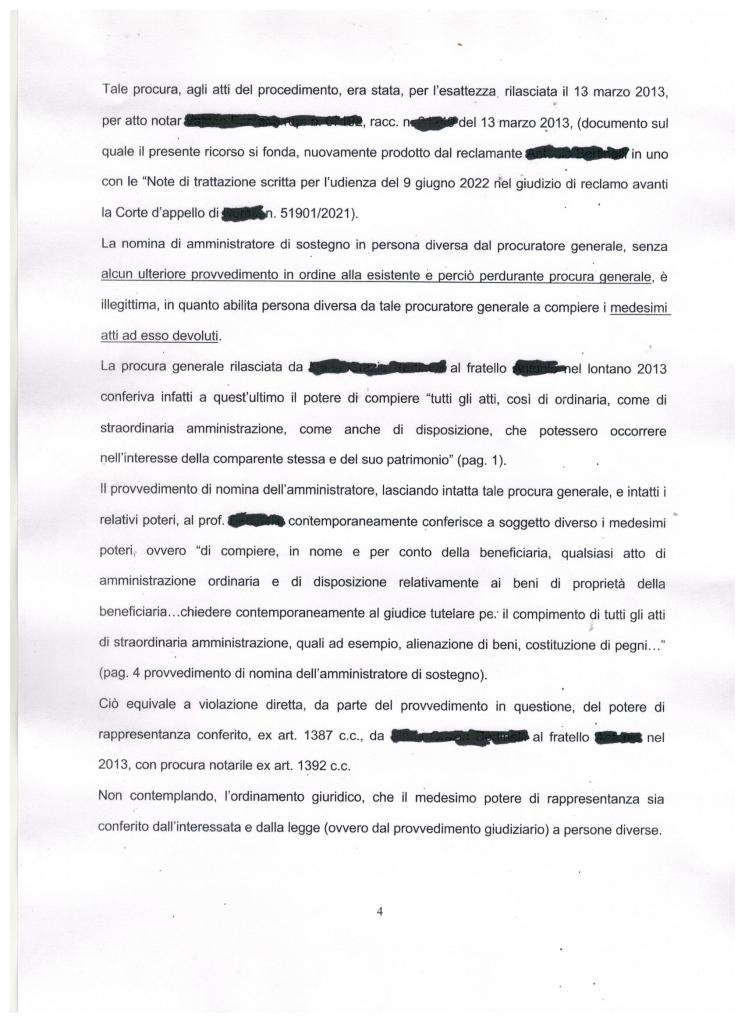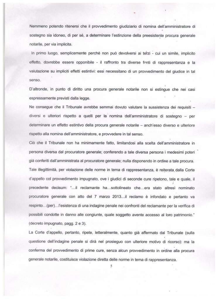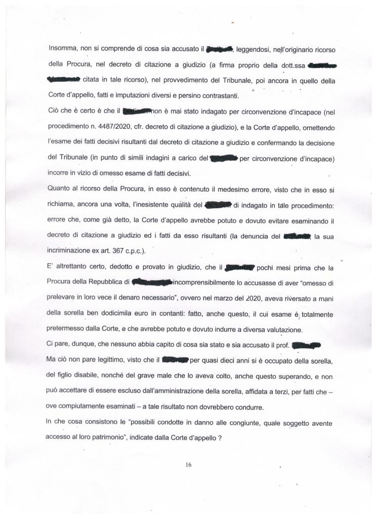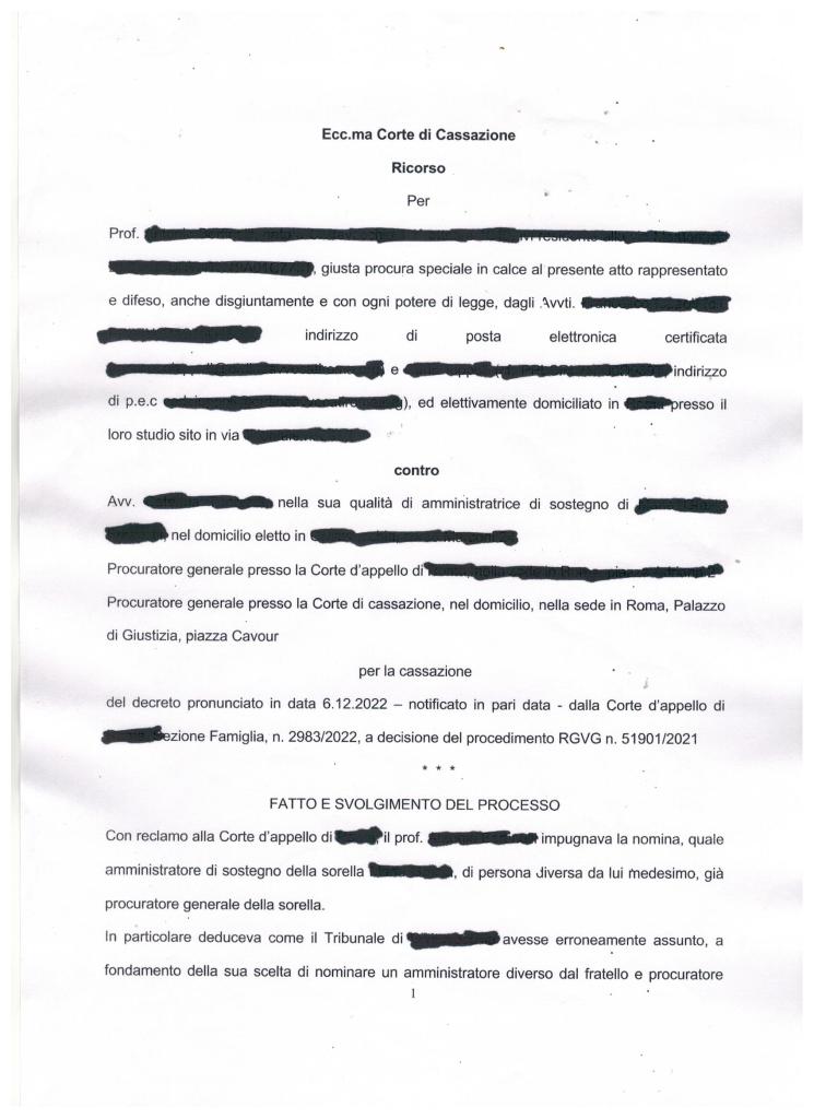 L’approssimarsi dell’udienza in Corte di Cassazione ci ha fatto propendere per la scelta di riportare integralmente il ricorso presentato dal nostro amico, malgrado la sua considerevole lunghezza. Lo scritto non fa voli pindarici, ma si limita ad incalzare in maniera semplice e finanche pedissequo la decisione del giudice di seconde cure appiattitosi sul decreto emanato dal giudice tutelare. Per questo motivo non rubiamo tempo al lettore divagando al di fuori della domanda depositata a febbraio 2023.