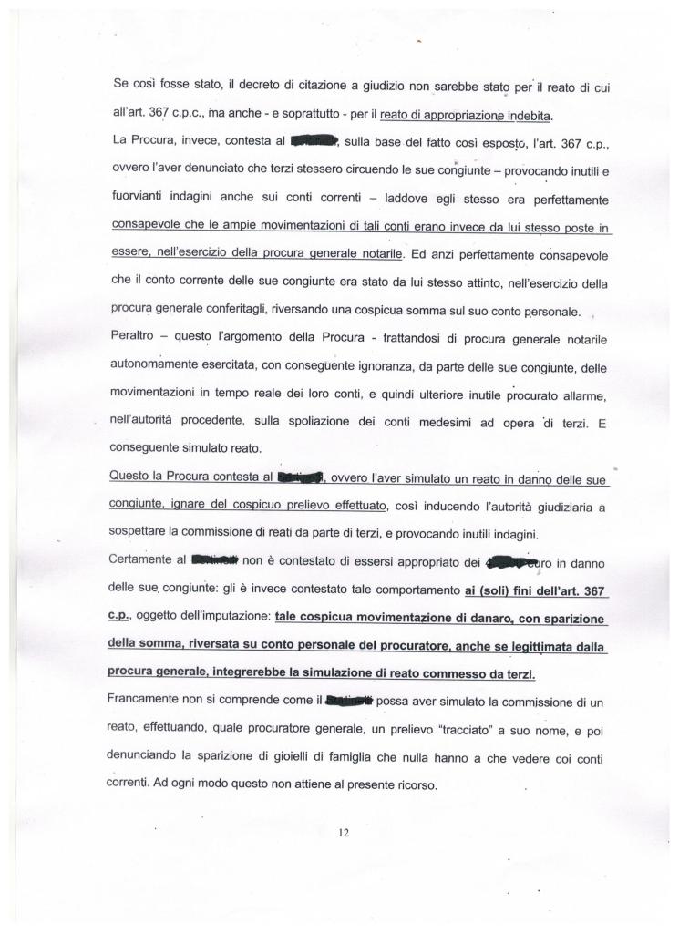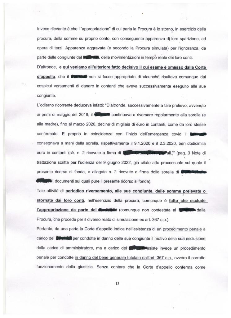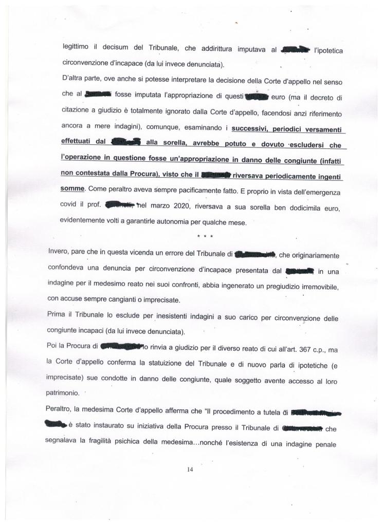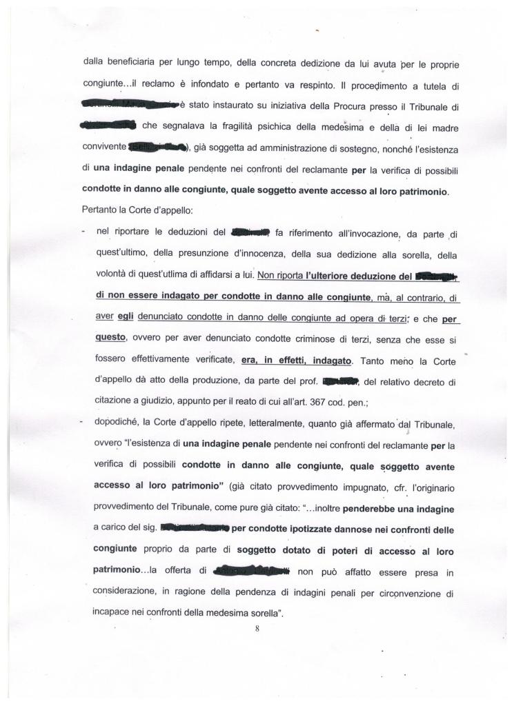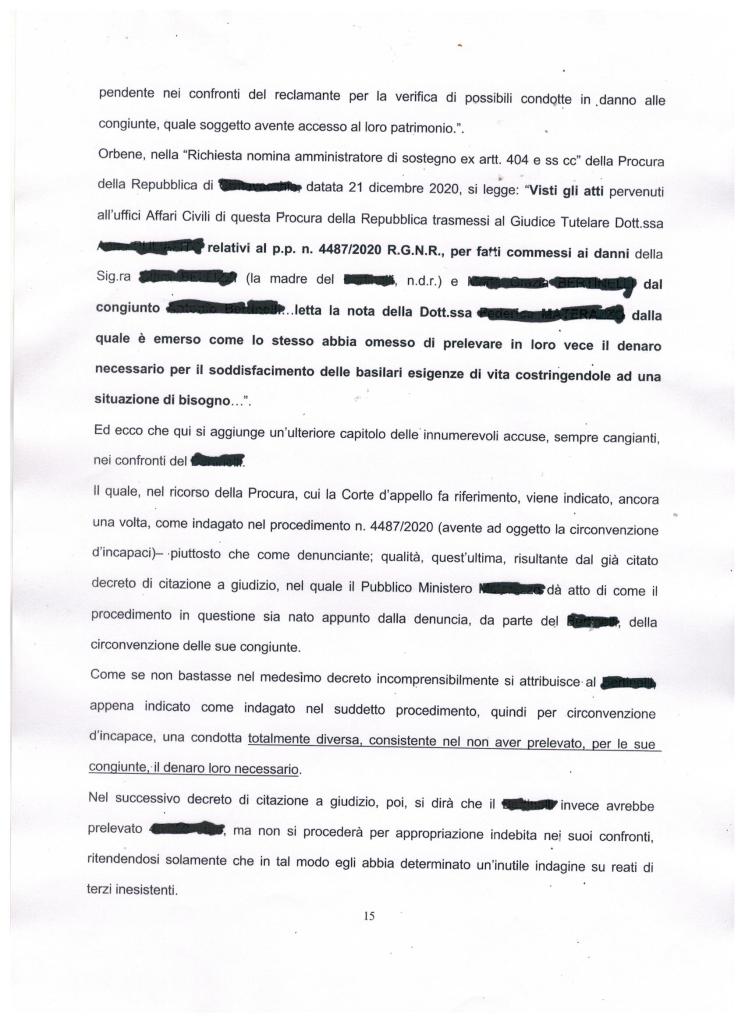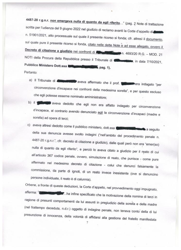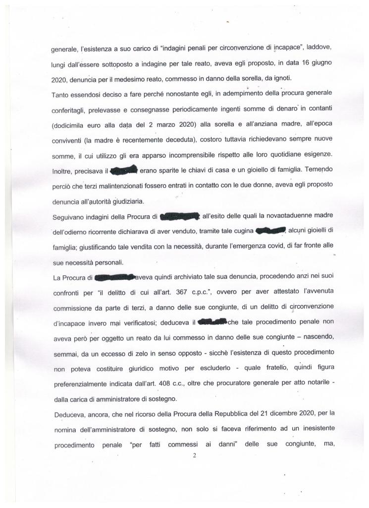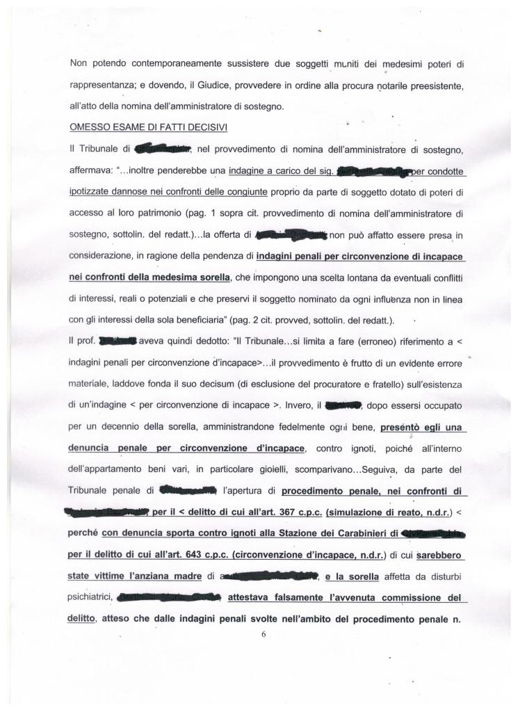 L’approssimarsi dell’udienza in Corte di Cassazione ci ha fatto propendere per la scelta di riportare integralmente il ricorso presentato dal nostro amico, malgrado la sua considerevole lunghezza. Lo scritto non fa voli pindarici, ma si limita ad incalzare in maniera semplice e finanche pedissequo la decisione del giudice di seconde cure appiattitosi sul decreto emanato dal giudice tutelare. Per questo motivo non rubiamo tempo al lettore divagando al di fuori della domanda depositata a febbraio 2023.