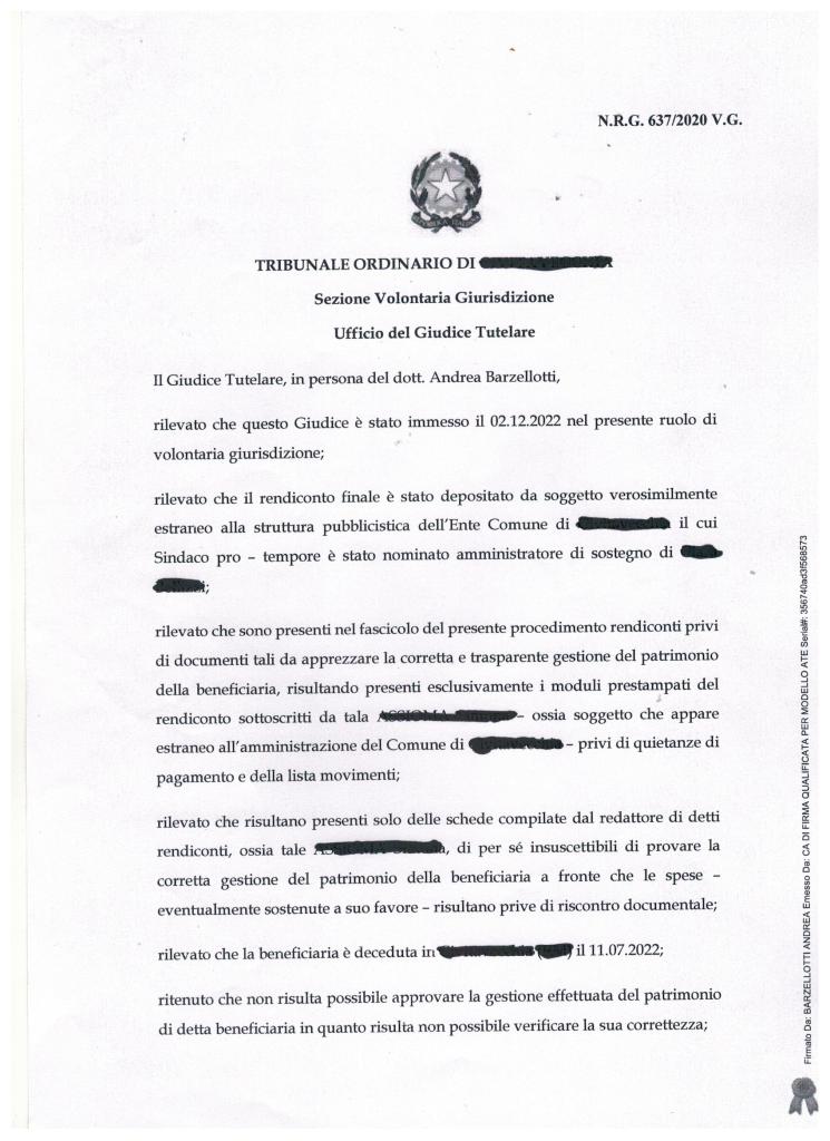 Il 10-6-2021, in Corte d’Appello, Anna Maria Pagliari, Marina Tucci, Gabriele Sordi bocciano la richiesta di sospensiva del decreto del giudice tutelare relativo all’amministrazione di sostegno per la madre, effettuata dall’istante, scrivendo: “ritenendo la genitrice bisognosa della misura di protezione e che nel suo atto di reclamo, così come nell’istanza di inibitoria, egli si duole solo del fatto che sia stato nominato AdS soggetto istituzionale, il sindaco del Comune di xxxxxxxxxx, e non lui stesso e che ciò comporterebbe il rischio di espoliazione della dimora della madre dagli oggetti preziosi ivi custoditi ed il trasferimento della stessa in ricovero presso una RSA; rilevato che avendo il Giudice Tutelare deciso la suddetta scelta dell’AdS a seguito di quanto in aula denunziato dalla beneficiaria contro il medesimo figlio (ritenuta si fragile ma affatto disorientata), non si ravvisano gli estremi per poter ravvisarsi né il fumus boni iuris né il periculum in mora a fondamento dell’istanza in quanto il soggetto istituzionale è tenuto ad operare nell’esclusivo interesse della beneficiaria sotto la sorveglianza del G.T. e dietro previa sua autorizzazione per gli atti di straordinaria amministrazione o per eventuali trattamenti assistenziali dei quali la sig.ra xxxxxx dovesse aver bisogno;