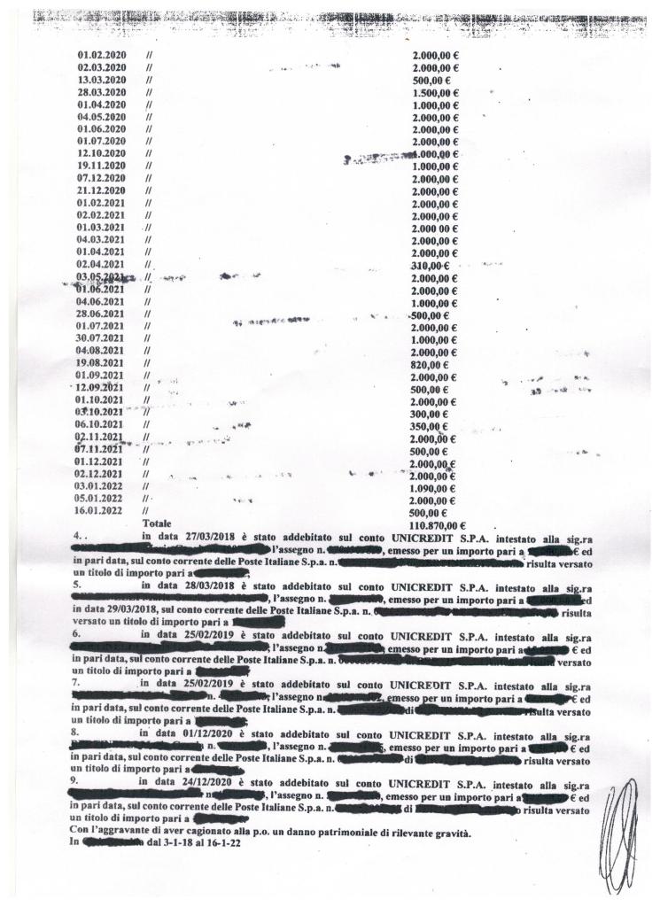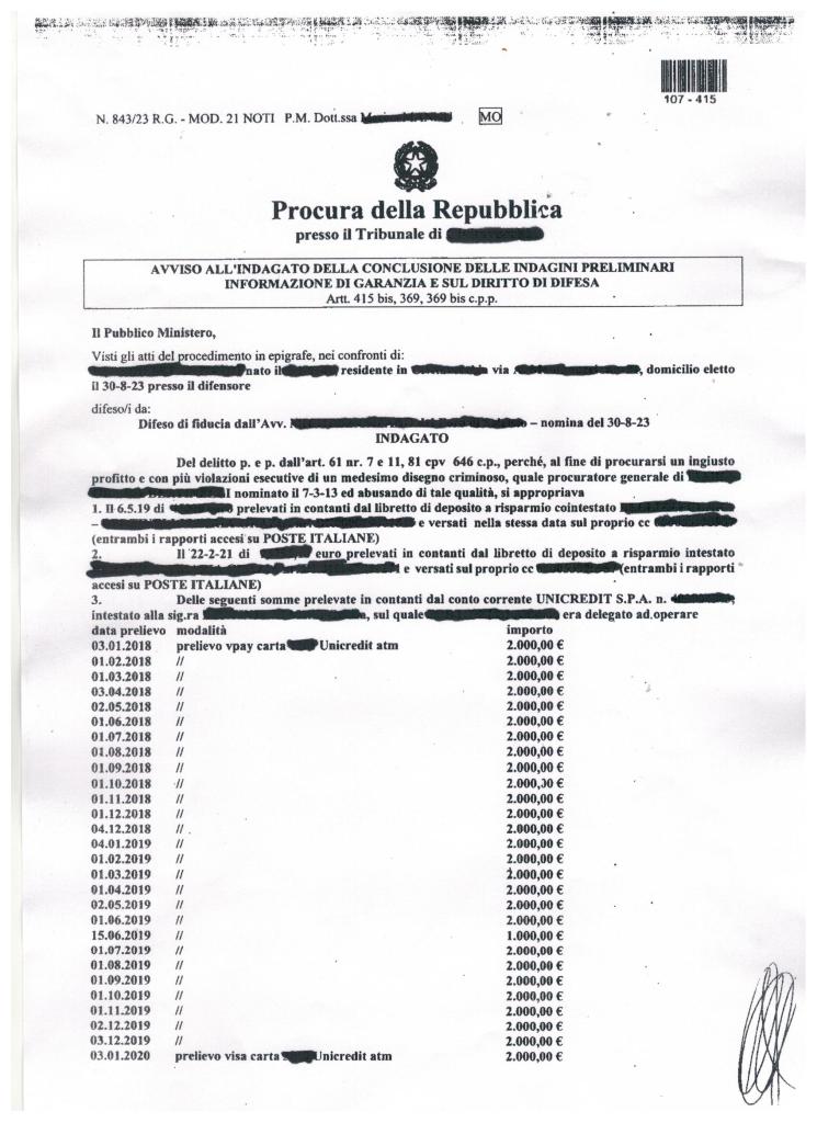 Al protagonista del nostro racconto è arrivato l’avviso di conclusioni delle indagini condotte a suo carico dal pubblico ministero. Prima di riportarne la copia facciamo una breve premessa. L’uomo era procuratore generale della germana. L’incarico di un A.d.S. può anche coesistere con una qualche forma di procura purché vengano predefinite dal giudice le sfere di azione dei due mandati. L’indagato, con questo solenne e potente strumento giuridico (tanto inviso negli ambienti degli A.d.S. da farlo considerare cartastraccia pure dagli stessi giudici) ha sempre movimentato il denaro della consanguinea. Ciò secondo le esigenze e/o le richieste della propria sorella. A lei sola doveva ed ha sempre reso conto di ogni euro e a lei ha consegnato tutte le somme richieste. Il 50% dei prelievi riportati sul prospetto sono stati effettuati direttamente dalla titolare del conto corrente. Per inciso va detto che l’indagato ha congrui documenti per dimostrare le dazioni di denaro fatte alla sorella negli anni analizzati dalla procura della Repubblica. Aggiungiamo che per quel lasso di tempo, nel 2020, il magistrato dell’epoca scrisse: “Anche l’esame degli estratti conti bancari non ha evidenziato nulla di anomalo”. Ora c’è chi ha interesse (e neanche poco !!!) a far rientrare dalla finestra quello che all’inizio della storia giudiziaria uscì giustamente dalla porta. Così riprende la musica di sempre. Dalla Vetta d’Italia a Lampedusa, da Capo d’Otranto alle Alpi Cozie, cambiano gli orchestrali ma lo spartito rimane lo stesso.