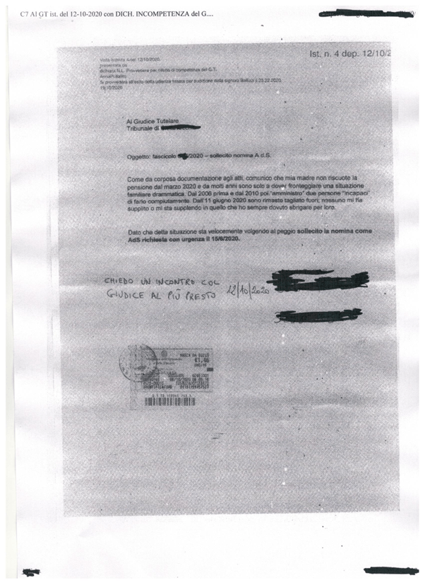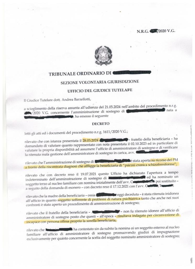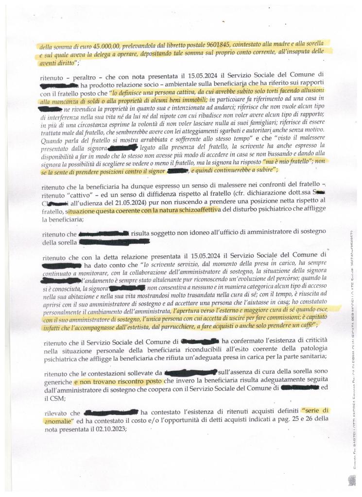 Alla “beneficiata”, come da prassi, si può mettere in bocca di tutto e di più. Basta che così facendo si compiacciano i committenti del servizio di monitoraggio. L’addestramento dei professionisti del conflitto prevede il prodigarsi per la rottura dei legami di solidarietà. Uno dei metodi più impiegati è quello di seminare zizzania in qualunque maniera tra congiunti. Un altro classico per rendere remissivo/succube il nucleo familiare sorvegliato è l’impiego delle debolezze del “beneficiato” (malattie comprese) prima contro di lui e poi contro i suoi affetti. Nel caso della vicenda di cui teniamo la cronaca da quattro anni, alcuni “benefattori”, introdottosi nell’abitazione materna in epoca di pandemia, hanno cominciato l’opera di insediamento raccontando delle fandonie alla genitrice del ricorrente. Per commentare il caso in esame ci limitiamo a dire che, a proposito della casa su cui discetta argutamente l’assistente sociale, il fratello dell’amministrata ha risposto a tutte le sue curiosità. Va solo aggiunto che al fine di rispettare i sogni della sorella (la quale voleva trasferirsi in quella dimora) l’uomo per salvaguardare quell’abitazione di vacanza, a tutt’oggi, ha speso 69.555,64 euro (soldi che avrebbe dovuto pagare l’amministrata giudiziaria). Dunque, andrebbe preso in considerazione ancora un altro credito per il “pluricolpevole” del tribunale in cui opera il giudice tutelare estensore del decreto.