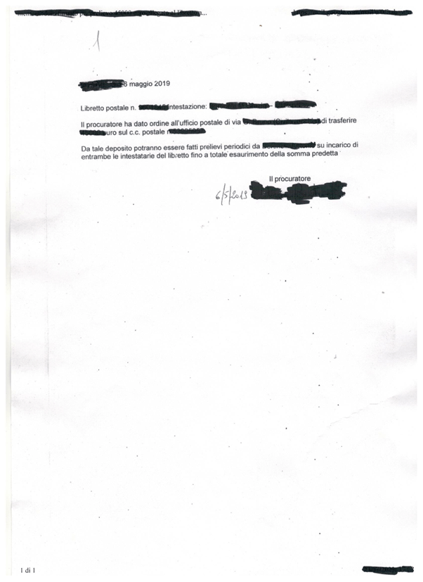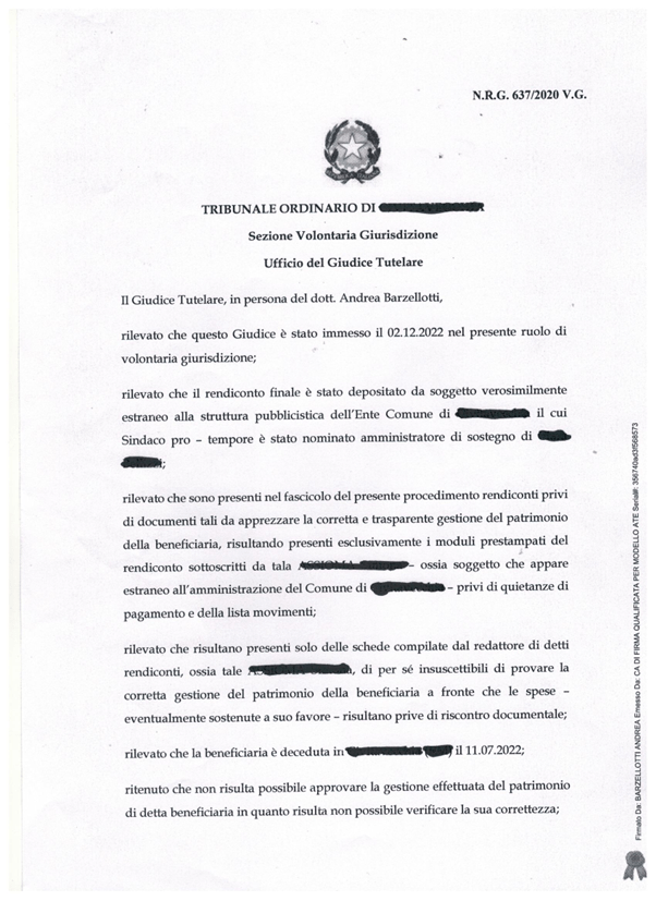 Mala gestio dell’AdS della madre (perdita stimata per sottrazione arbitraria dell’incaricato S. A., dipendente di una associazione di servizi sociali privata, di oltre 10000 euro)