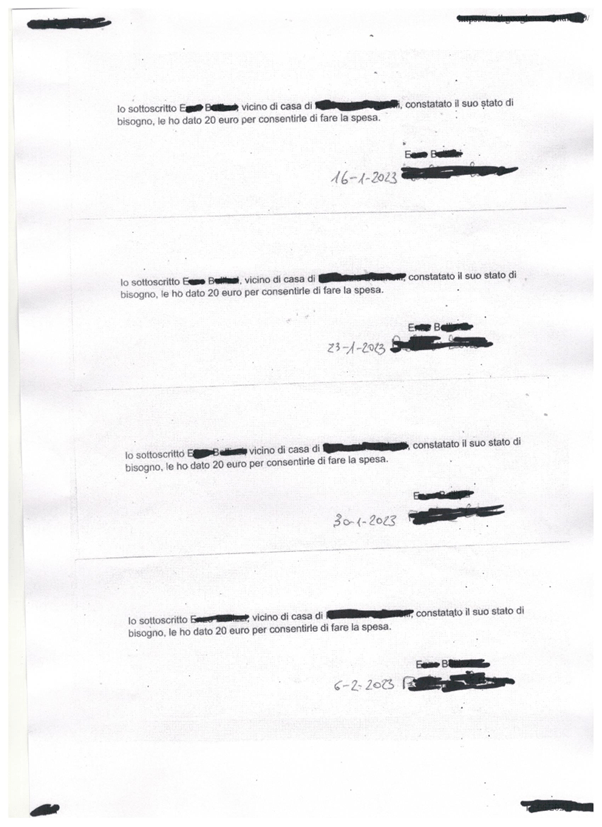 La ciclica questua della sorella, rimasta frequentemente priva di denaro tanto da chiedere soldi ad un suo vicino di casa. Forse perché pretendeva dall’AdS C. T. e dall’assistente assistente sociale S. C. “acquisti particolari” e dunque faceva spendere loro tutta la sua pensione?