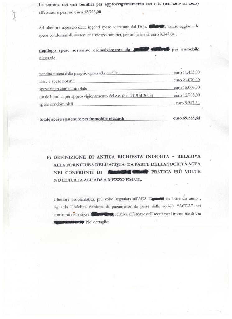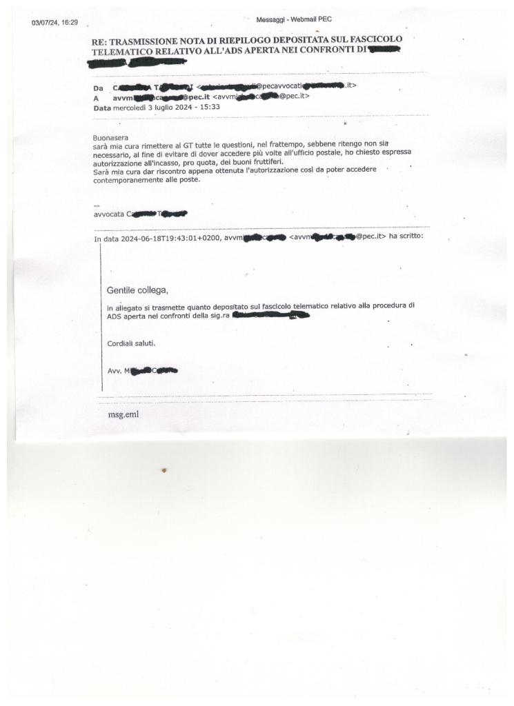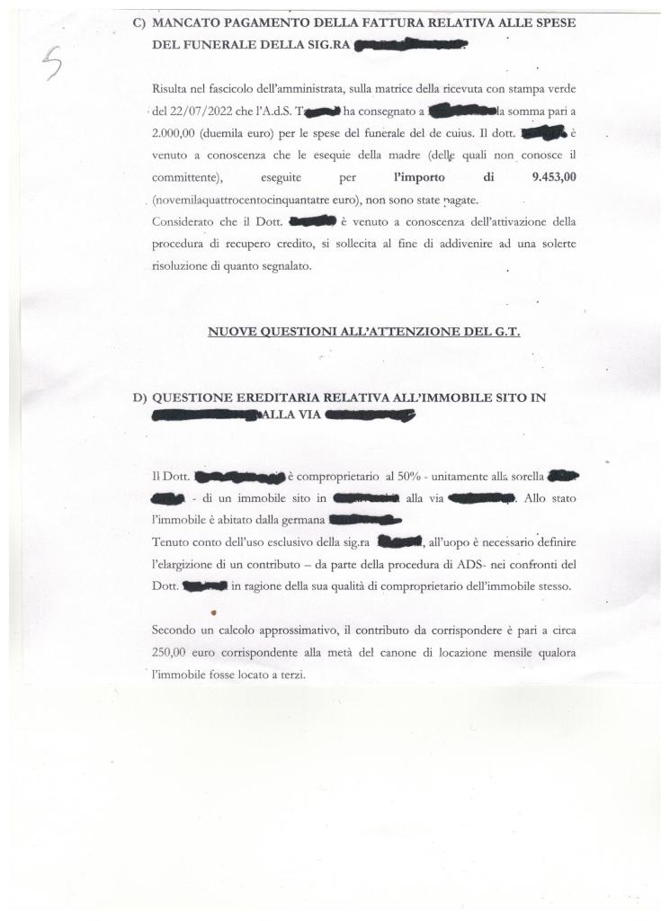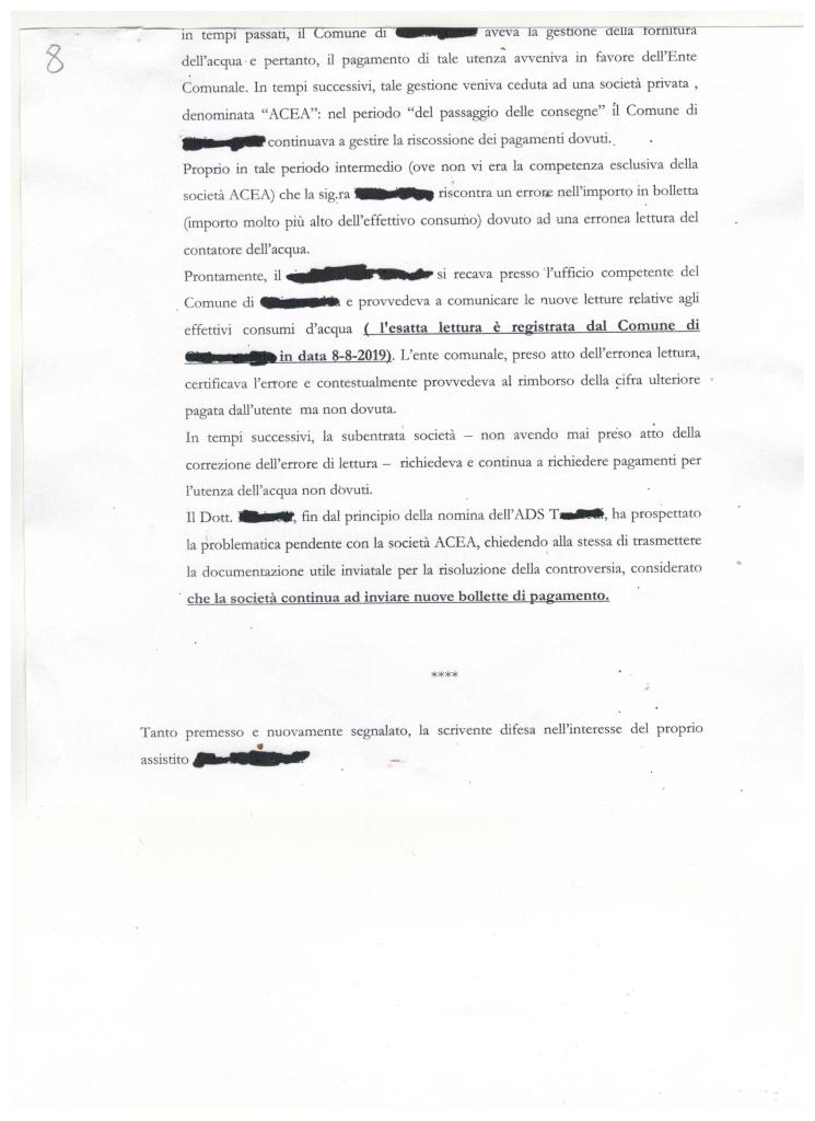 La nostra cronaca prosegue. Fatte le dovute eccezioni, l’immissione forzata di un AdS esogeno in qualunque famiglia porta allo scompiglio, anche amministrativo. La figura giuridica è un corpo estraneo di cui si avverte quotidianamente l’ingombrante, gretta, tracotante e cavillosa presenza. Ricordiamo che la madre del nostro amico è deceduta due anni fa. Ancora oggi non è stata definita la richiesta indebita dell’Acea di cui si fa cenno nella sesta puntata. Ancora oggi ci sono aspetti economici rimasti irrisolti. Di seguito mettiamo l’ultimo documento depositato in tribunale e le ricevute di due PEC.