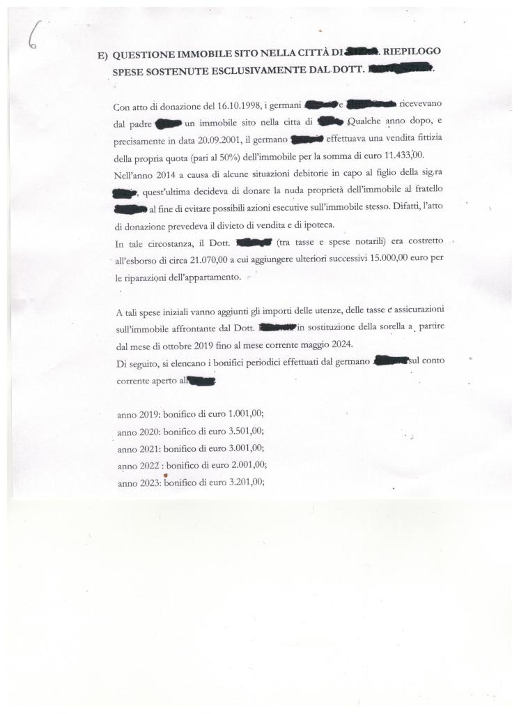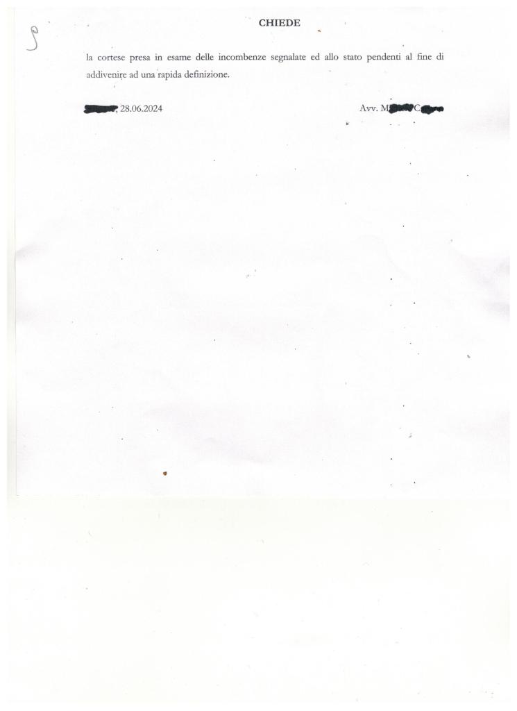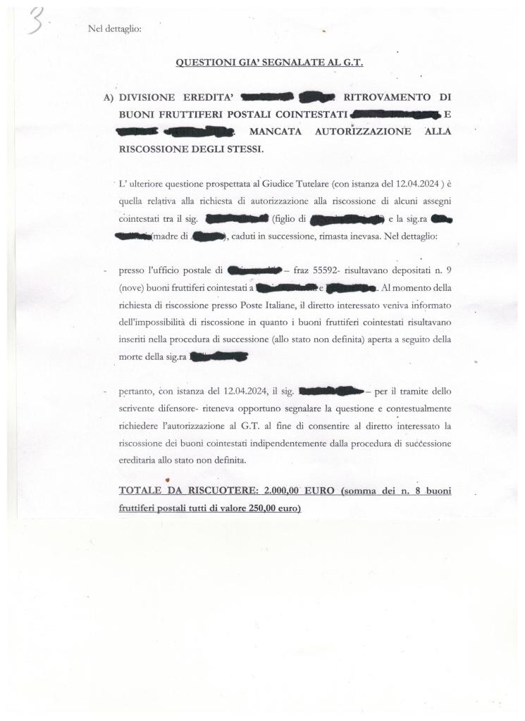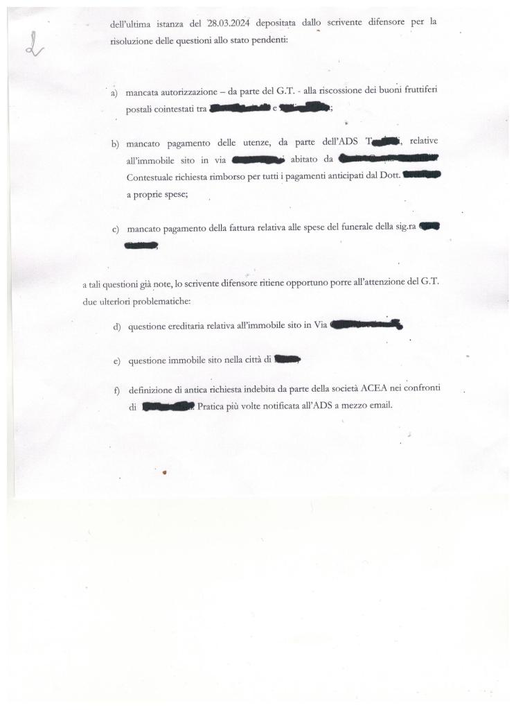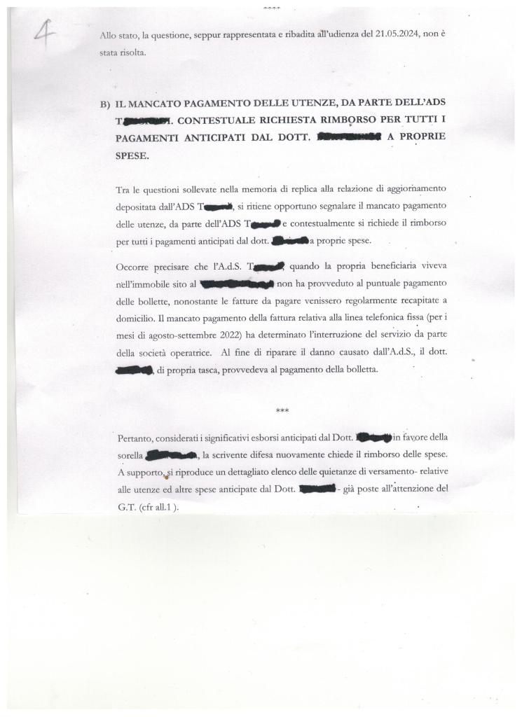 La nostra cronaca prosegue. Fatte le dovute eccezioni, l’immissione forzata di un AdS esogeno in qualunque famiglia porta allo scompiglio, anche amministrativo. La figura giuridica è un corpo estraneo di cui si avverte quotidianamente l’ingombrante, gretta, tracotante e cavillosa presenza. Ricordiamo che la madre del nostro amico è deceduta due anni fa. Ancora oggi non è stata definita la richiesta indebita dell’Acea di cui si fa cenno nella sesta puntata. Ancora oggi ci sono aspetti economici rimasti irrisolti. Di seguito mettiamo l’ultimo documento depositato in tribunale e le ricevute di due PEC.