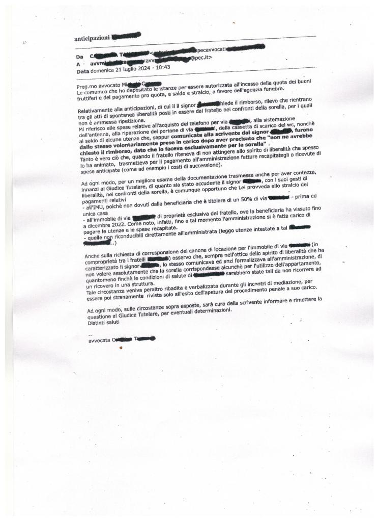 Il 14/3/2023 il nostro amico rispondeva via mail ad una domanda dell’AdS C.T.: “Fornisco riscontro della sua ultima comunicazione. Colgo l’occasione per parteciparle che appena avrò un pò di tempo disponibile raccoglierò tutti i pagamenti effettuati per conto di mia sorella per poi inviarle la documentazione completa. Il fascicoletto dedicato alla relativa raccolta, peraltro non completo, né dettagliato me lo aveva chiesto l’avvocato F. I. per dargli un sommario sguardo.”