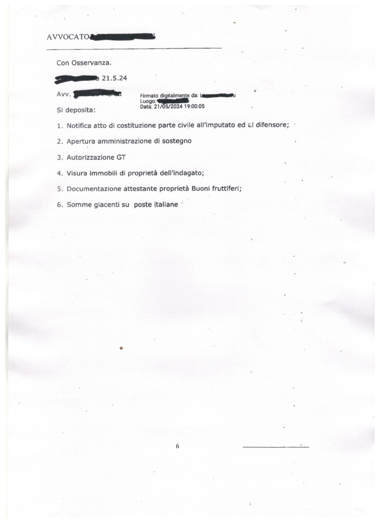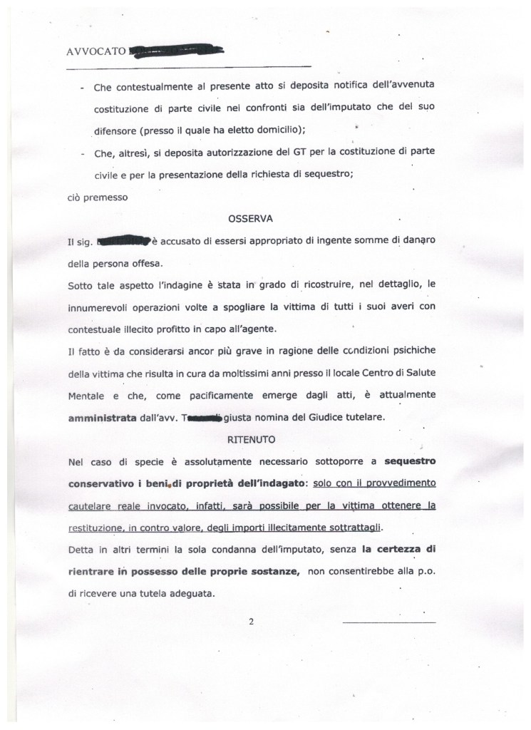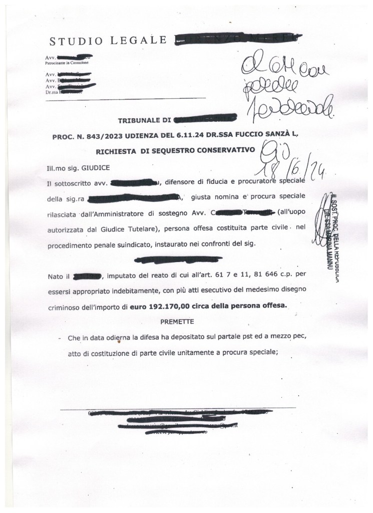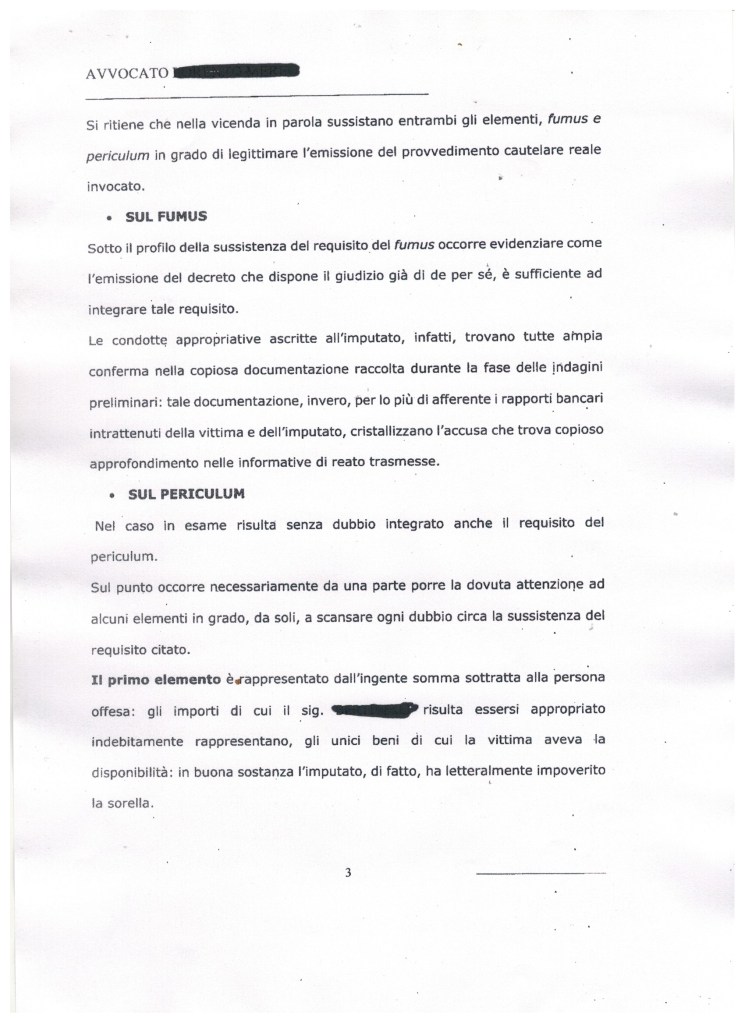 Alla denuncia dell’AdS della sorella era seguita la memoria difensiva del nostro amico di cui le parti meno tecniche (quelle che entrano nel merito) sono state pubblicate nelle puntate n. 157 e n. 158. La parte iniziale del citato documento rileva la tardività della presentazione della denuncia da parte dell’AdS. In tempi successivi (comunque tardivi), presumibilmente per rivalsa, lo stesso amministratore ha rincarato la dose presentando anche una richiesta di sequestro conservativo nei confronti del fratello della sua amministrata. L’istanza, peraltro rigettata (vedi puntata n. 168) dal giudice adito è giunta nelle mani dell’imputato e quindi da lui conoscibile soltanto a ridosso dell’udienza predibattimentale.