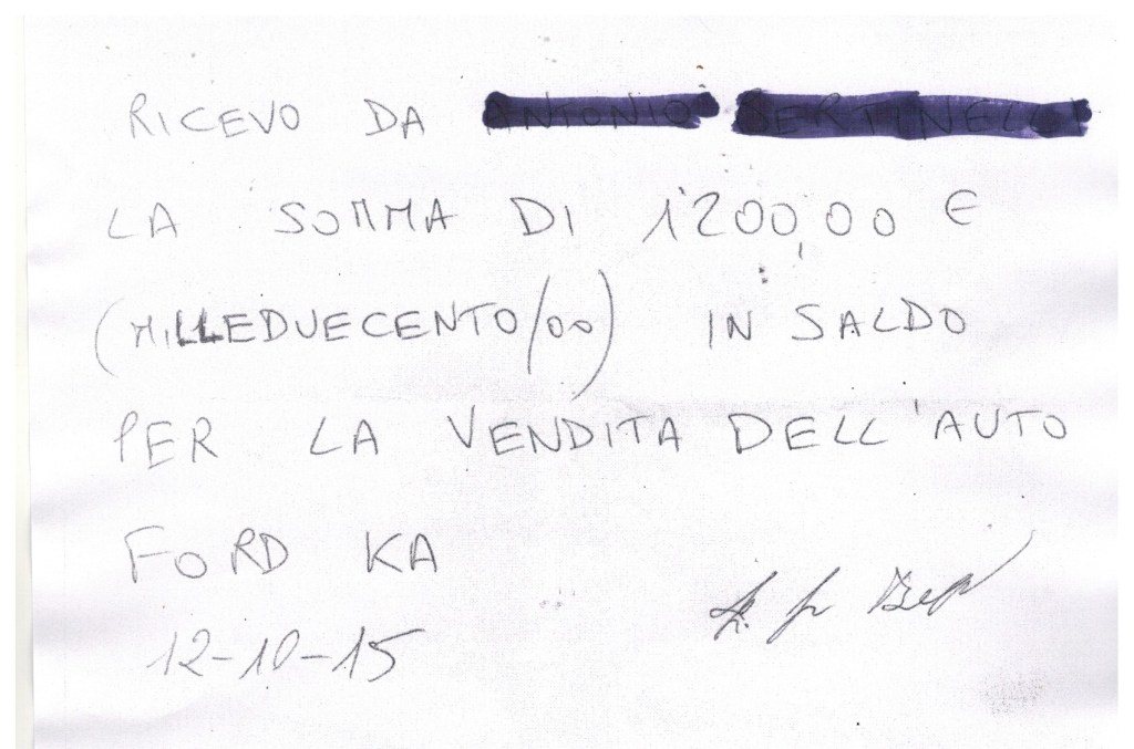 L’AdS della sorella del nostro amico aveva sostenuto e scritto che l’uomo si fosse arbitrariamente impossessato di un’auto. Evento mai verificatosi. L’auto in oggetto era gravemente incidentata per cui l’uomo pagò alla sorella anche più del suo valore effettivo al fine di acquistarla regolarmente. Ecco la ricevuta della transazione: