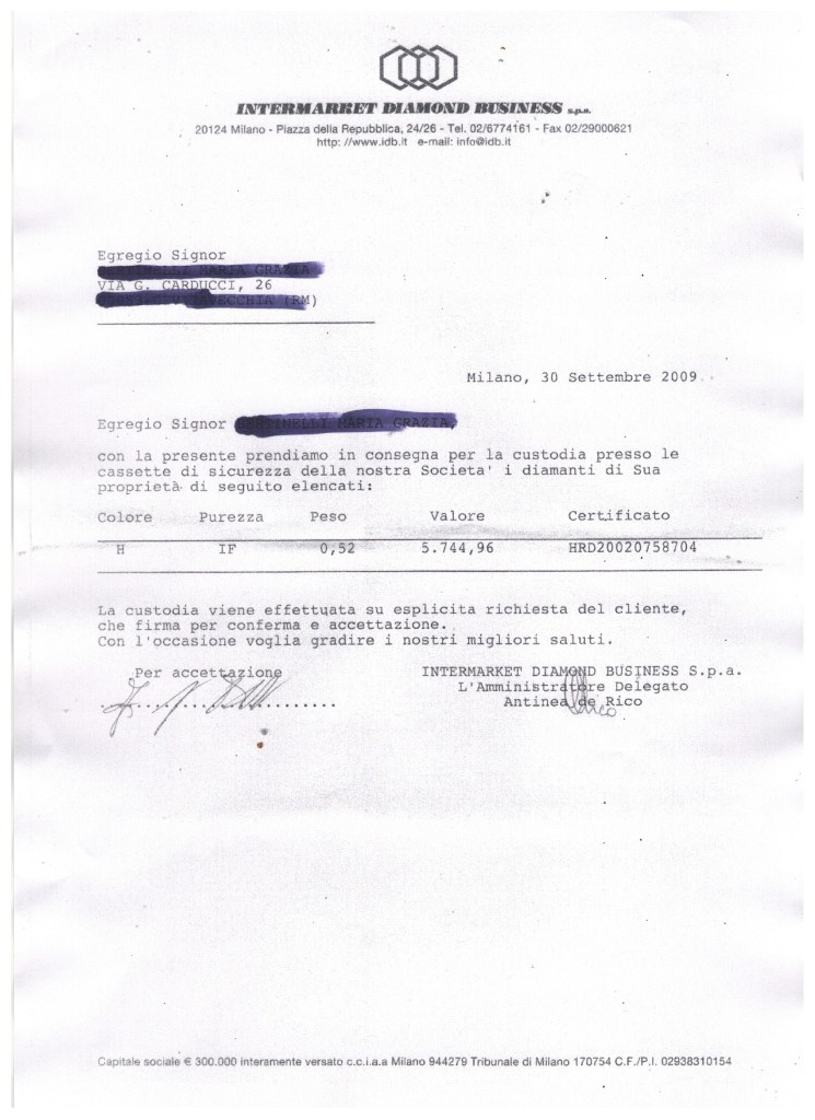 L’AdS della sorella del nostro amico aveva insinuato che l’uomo avesse fatto investimenti in diamanti per conto della germana. Cosa mai fatta. Ecco un documento di sottoscrizione firmato dall’attuale amministrata: