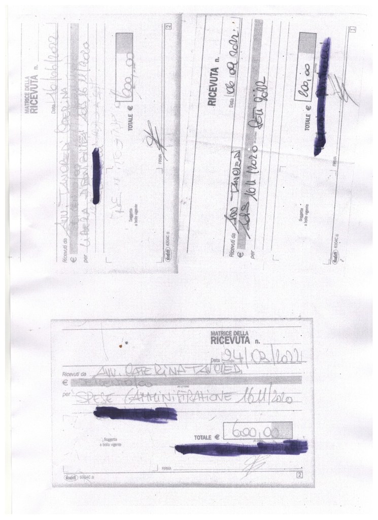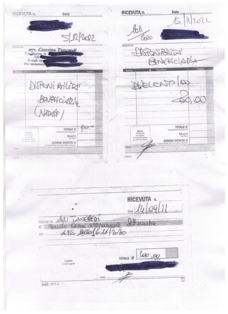 L’ AdS della sorella del nostro amico aveva sempre sostenuto di provvedere soddisfacentemente alle necessità economiche dell’amministrata. A fronte di una disponibilità economica della donna pari a 2800 euro mensili, che può riscuotere l’AdS, ecco il riscontro delle somme da essa consegnate in un determinato lasso di tempo dell’anno 2022. Su una delle quietanze manca la firma dell’amministrata: