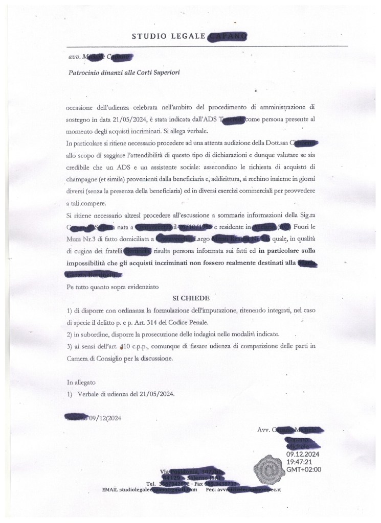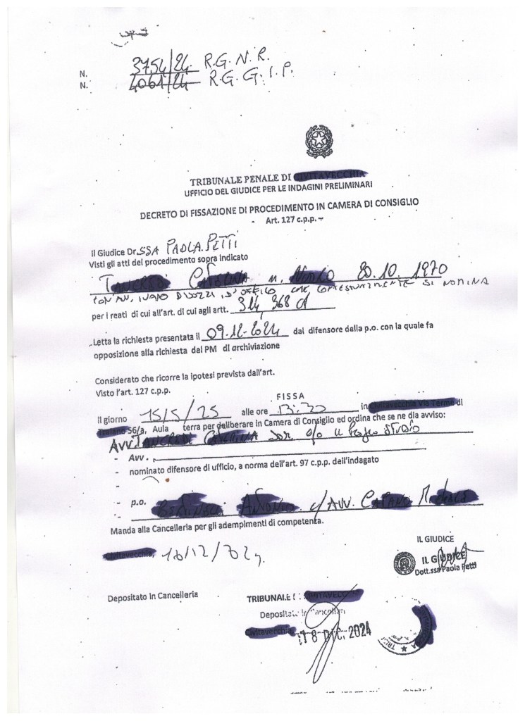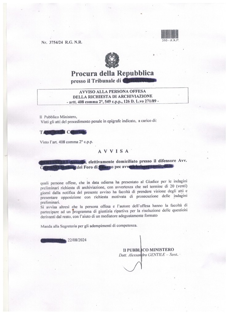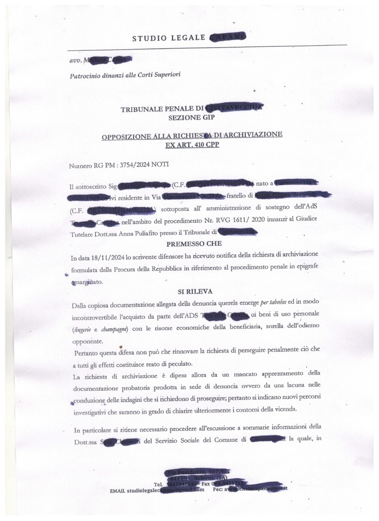 Passiamo ad altro ed aggiorniamo il lettore sulla richiesta di archiviazione che il p.m. Alessandro Gentile ha chiesto per l’AdS avv. C. T. dopo la dettagliata denuncia presentata illo tempore dal protagonista della nostra storia per peculato ed altri reati, incollando di seguito la copia delle relative pagine. L’udienza connessa ci sarà il 15/5/2025.