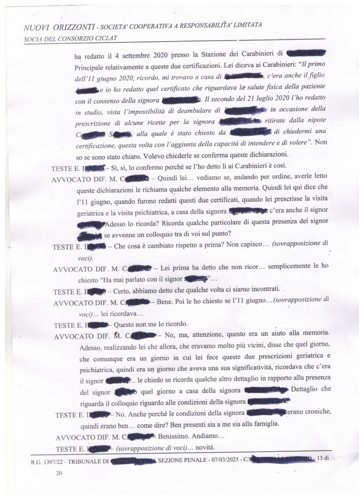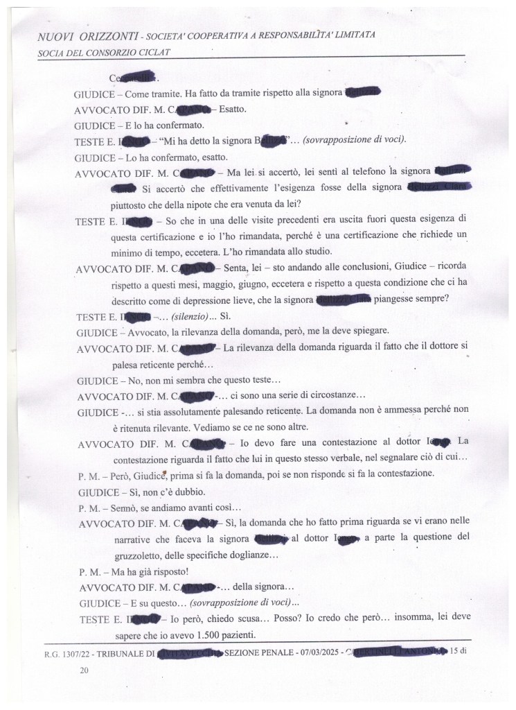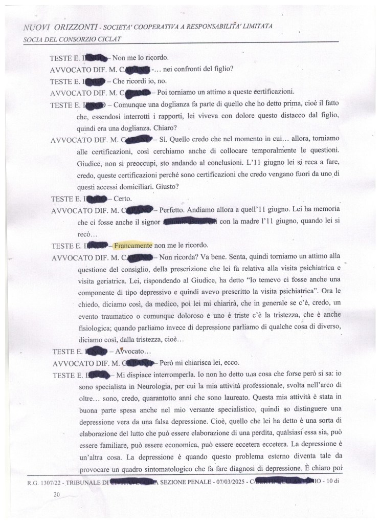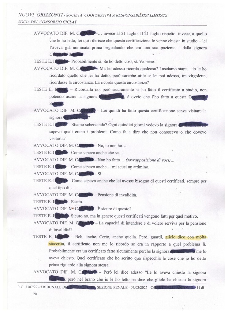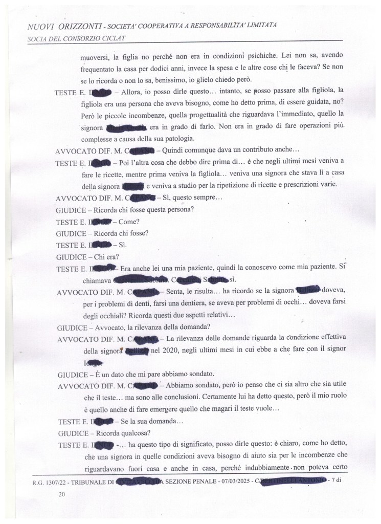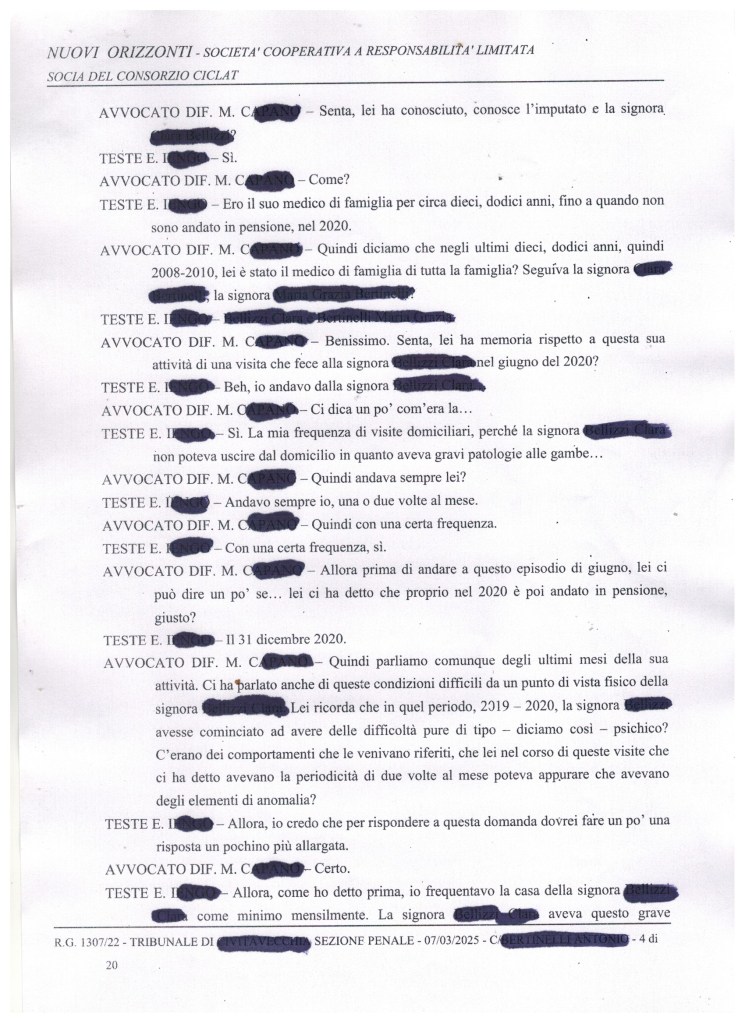 Con l’escussione del medico E. I. si conclude la sfilata dei testi “suggestionati” dal prelievo che l’imputato (procuratore generale della sorella) ha effettuato, peraltro quietanzandolo (pur non avendone l’obbligo giuridico), nel maggio del 2019 su un libretto postale delle sue congiunte. Che anche il professionista fosse a conoscenza dell’episodio lo abbiamo scoperto solo durante l’udienza del 7/3/25. Nel corso della testimonianza resa ai carabinieri il 4/9/2020, circostanza in cui riuscì a dribblare quasi tutte le domande fattegli dal maresciallo incaricato, il dott. E. I. non aveva fatto cenno alla cosa. Dopo le falsità propalate dalla cugina del nostro amico (quella che si prestava a vendere ripetutamente i preziosi della zia) e le cure dell’avvocato G.C. (quello della procura speciale per un morto) che si premurava di fare spesso visita alla madre dell’imputato, a suo dire, per confortarla, arriva anche il medico curante della genitrice dell’imputato, che si ricorda il dispiacere della sua assistita per la “perdita” del “gruzzoletto” (in verità mai subita a causa del figlio). E’ insolito che nessuno dei tre personaggi, malgrado la loro loquacità, abbozza una qualche frase sulla sistematica spoliazione (volatilizzazione di beni e denaro) di cui è stata vittima la novantaduenne, madre dell’imputato. Si rammenta che il protagonista della storia che stiamo raccontando, il 13/6/2020, ha trovato “sbarrata” la porta dell’abitazione delle sue due congiunte, le cui frequentazioni si limitavano perlopiù alla parente S.C, all’avvocato G.C. e al medico di famiglia E. I.. Da quella data l’imputato non ha più messo piede in quella casa fino al decesso della sua genitrice. Il dott. E. I. , nel corso della sua testimonianza in udienza, premettendo la sua “franchezza” (cosa da noi evidenziata in giallo per tre volte) sulla trascrizione allegata) non ricorda alcuna conversazione avuta con l’imputato in merito allo stato di salute della sua assistita più anziana. Lo stesso medico asserisce che il suo rilascio di tre documenti medici, a giugno e luglio 2020, per l’occasione portati in aula dal processato, sono dovuti all’esortazione (diretta alla sua paziente novantaduenne) per richiedere il riconoscimento formale di invalidità. Si dà il caso che l’anziana, a causa delle sue datate gravi patologie, nel 2020, è già da molti anni che gode di erogazioni previdenziali consone, ragione per cui il medico curante, da tanto tempo, dovrebbe conoscere il suo codice di invalidità INPS. In realtà la richiesta di accertamenti clinici (visita psichiatrica e geriatrica) venne effettuata dal testimone su preoccupato input del figlio dell’assistita. La preoccupazione dell’uomo fu manifestata telefonicamente al medico curante dopo l’imprevista “cacciata” del notaio che, recatosi a domicilio su richiesta della disabile, le avrebbe dovuto far firmare una procura generale redatta nei mesi precedenti. Il certificato medico rilasciato il mese successivo, in cui si asseverano le “perfette” condizioni psichiche dell’assistita, venne richiesto dalla nipote dell’anziana ed usato per consentire alla madre dell’imputato di firmare una procura speciale all’avvocato G.C. Tutti e tre i documenti medici di cui sopra, successivamente depositati nei fascicoli del tribunale, sparirono poi nel nulla. Alla citata marcata “stranezza” comportamentale della novantaduenne, constatata con tempestiva arguzia anche dall’equipe notarile, ne seguirono altre che al dottore curante E.I. non dovrebbero essere sfuggite. Il teste ha scordato che la sua paziente, nel 2020, era già un’invalida 100% INPS, dunque non avrebbe potuto reclamare un diritto già acquisito. Il dott. E. I., dimentico anche di tante altre cose, si dimostra particolarmente loquace nell’affrontare i problemi di salute della sua paziente più giovane. Le esigenze di copione richieste per la circostanza (grazie a delle immancabili compiacenze ?) lo trasformano in meticoloso relatore. E’ così che, davanti alla domanda dell’avvocato della controparte, del tutto fuori del perimetro del capo d’imputazione oggetto del processo, ritrova una memoria di ferro. All’avvocato dell’imputato, solo dopo le sue puntuali contestazioni, ha dovuto riconoscere, obtorto collo, ciò che era stato verbalizzato in altre sedi. L’assist dell’avvocato P.P. lo aiuta invece a descrivere nel dettaglio la sua paziente più giovane dell’epoca, a cui fa riferimento come soggetto incapace di qualunque azione sensibilmente articolata. In verità la donna, contraddicendo nei fatti la convinzione del dott. E.I., si dimostra a lungo capace di affrontare anche numerose azioni “complesse”. Riportiamo l’ultimo atto di cui siamo conoscenza, che la sorella dell’imputato per simulazione di reato ha compiuto autonomamente: il 12/2/2021 ha prelevato da un libretto postale, all’ufficio relativo, ventimila €. L’operazione è attestata dalla Guardia di Finanza nell’annotazione di PG dell’1/9/2023.