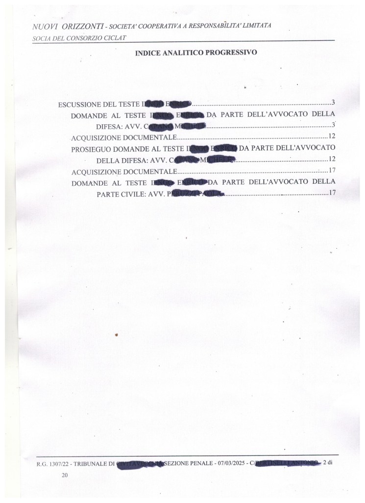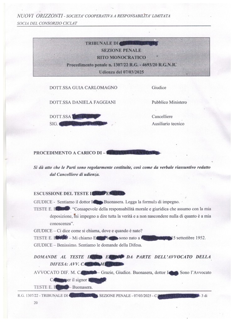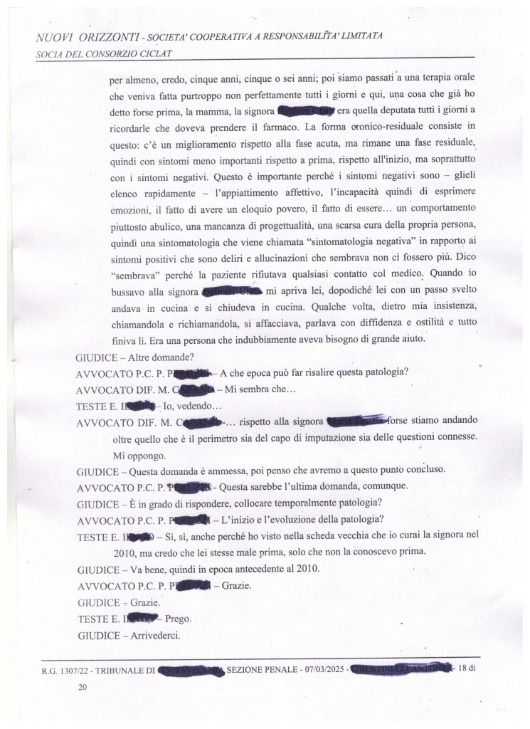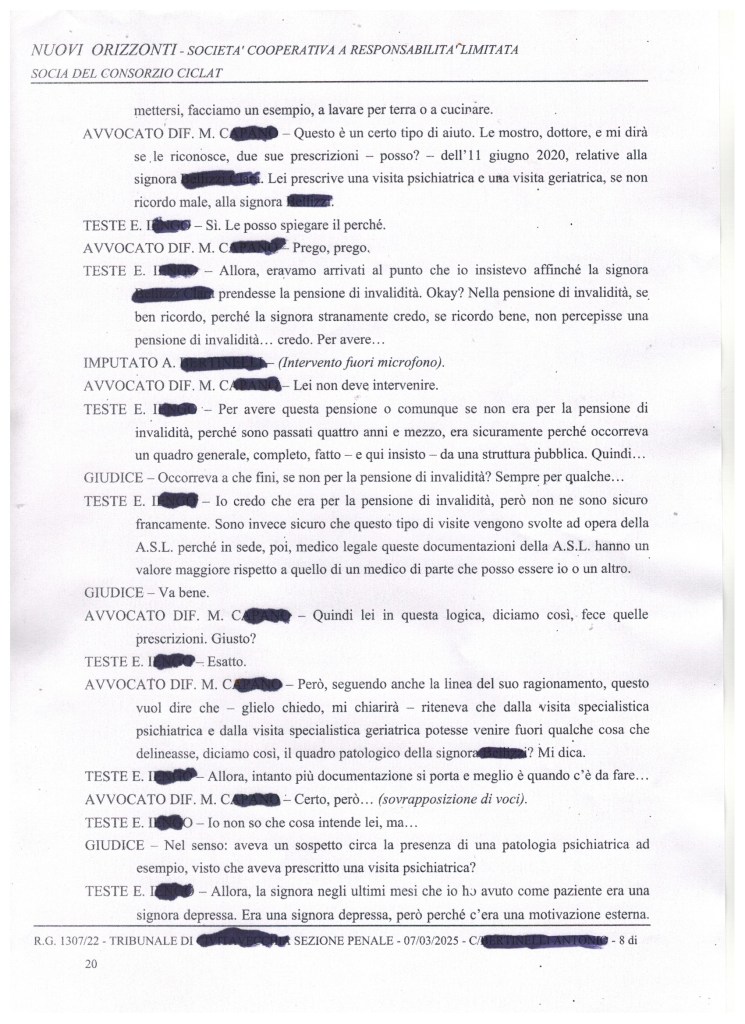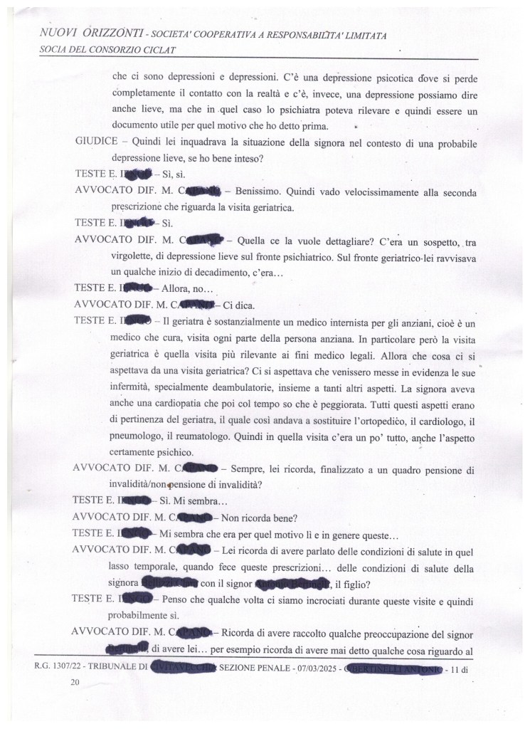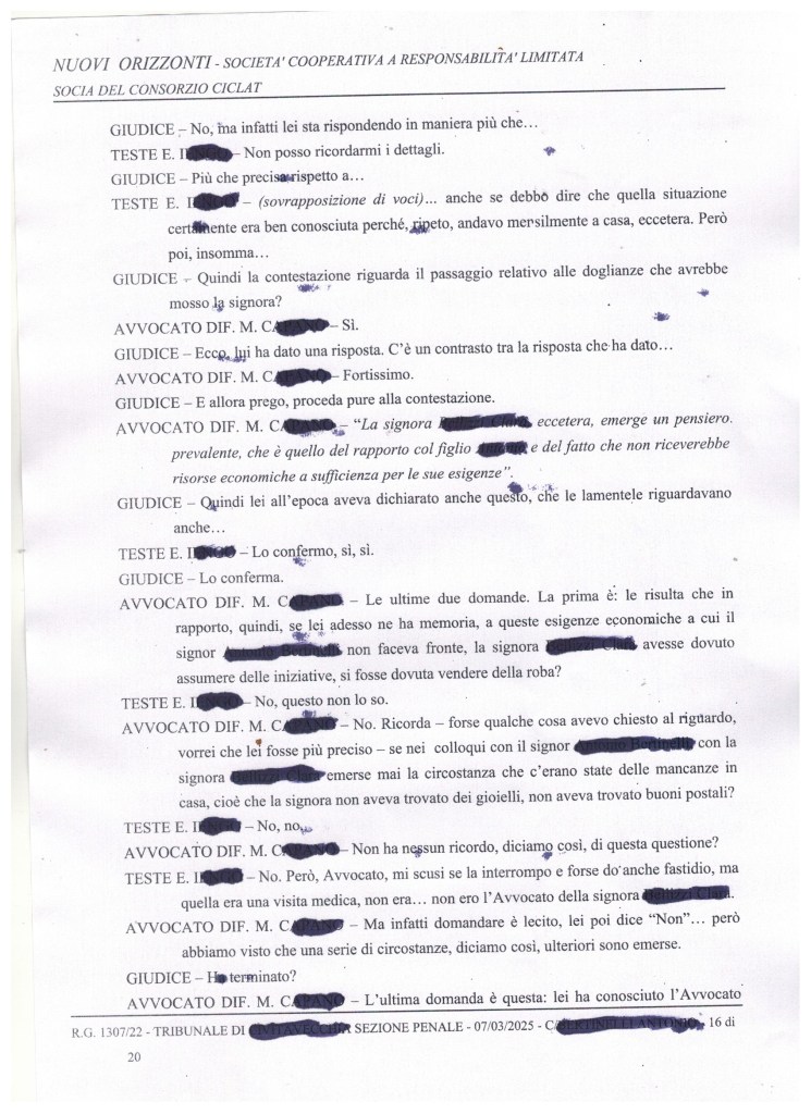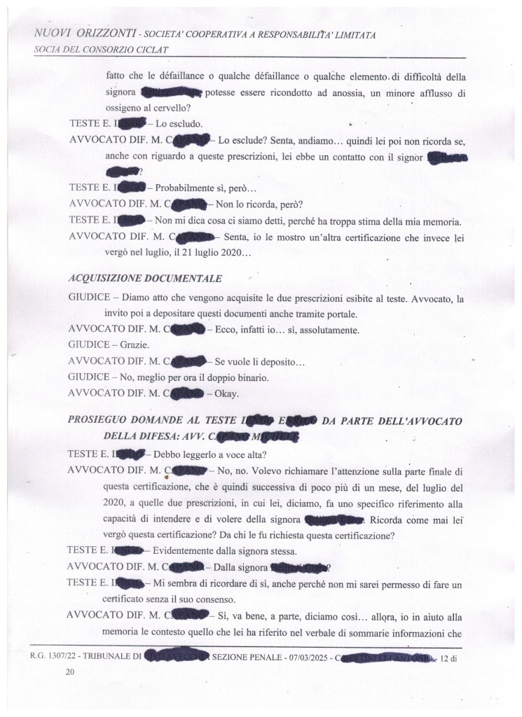 Con l’escussione del medico E. I. si conclude la sfilata dei testi “suggestionati” dal prelievo che l’imputato (procuratore generale della sorella) ha effettuato, peraltro quietanzandolo (pur non avendone l’obbligo giuridico), nel maggio del 2019 su un libretto postale delle sue congiunte. Che anche il professionista fosse a conoscenza dell’episodio lo abbiamo scoperto solo durante l’udienza del 7/3/25. Nel corso della testimonianza resa ai carabinieri il 4/9/2020, circostanza in cui riuscì a dribblare quasi tutte le domande fattegli dal maresciallo incaricato, il dott. E. I. non aveva fatto cenno alla cosa. Dopo le falsità propalate dalla cugina del nostro amico (quella che si prestava a vendere ripetutamente i preziosi della zia) e le cure dell’avvocato G.C. (quello della procura speciale per un morto) che si premurava di fare spesso visita alla madre dell’imputato, a suo dire, per confortarla, arriva anche il medico curante della genitrice dell’imputato, che si ricorda il dispiacere della sua assistita per la “perdita” del “gruzzoletto” (in verità mai subita a causa del figlio). E’ insolito che nessuno dei tre personaggi, malgrado la loro loquacità, abbozza una qualche frase sulla sistematica spoliazione (volatilizzazione di beni e denaro) di cui è stata vittima la novantaduenne, madre dell’imputato. Si rammenta che il protagonista della storia che stiamo raccontando, il 13/6/2020, ha trovato “sbarrata” la porta dell’abitazione delle sue due congiunte, le cui frequentazioni si limitavano perlopiù alla parente S.C, all’avvocato G.C. e al medico di famiglia E. I.. Da quella data l’imputato non ha più messo piede in quella casa fino al decesso della sua genitrice. Il dott. E. I. , nel corso della sua testimonianza in udienza, premettendo la sua “franchezza” (cosa da noi evidenziata in giallo per tre volte) sulla trascrizione allegata) non ricorda alcuna conversazione avuta con l’imputato in merito allo stato di salute della sua assistita più anziana. Lo stesso medico asserisce che il suo rilascio di tre documenti medici, a giugno e luglio 2020, per l’occasione portati in aula dal processato, sono dovuti all’esortazione (diretta alla sua paziente novantaduenne) per richiedere il riconoscimento formale di invalidità. Si dà il caso che l’anziana, a causa delle sue datate gravi patologie, nel 2020, è già da molti anni che gode di erogazioni previdenziali consone, ragione per cui il medico curante, da tanto tempo, dovrebbe conoscere il suo codice di invalidità INPS. In realtà la richiesta di accertamenti clinici (visita psichiatrica e geriatrica) venne effettuata dal testimone su preoccupato input del figlio dell’assistita. La preoccupazione dell’uomo fu manifestata telefonicamente al medico curante dopo l’imprevista “cacciata” del notaio che, recatosi a domicilio su richiesta della disabile, le avrebbe dovuto far firmare una procura generale redatta nei mesi precedenti. Il certificato medico rilasciato il mese successivo, in cui si asseverano le “perfette” condizioni psichiche dell’assistita, venne richiesto dalla nipote dell’anziana ed usato per consentire alla madre dell’imputato di firmare una procura speciale all’avvocato G.C. Tutti e tre i documenti medici di cui sopra, successivamente depositati nei fascicoli del tribunale, sparirono poi nel nulla. Alla citata marcata “stranezza” comportamentale della novantaduenne, constatata con tempestiva arguzia anche dall’equipe notarile, ne seguirono altre che al dottore curante E.I. non dovrebbero essere sfuggite. Il teste ha scordato che la sua paziente, nel 2020, era già un’invalida 100% INPS, dunque non avrebbe potuto reclamare un diritto già acquisito. Il dott. E. I., dimentico anche di tante altre cose, si dimostra particolarmente loquace nell’affrontare i problemi di salute della sua paziente più giovane. Le esigenze di copione richieste per la circostanza (grazie a delle immancabili compiacenze ?) lo trasformano in meticoloso relatore. E’ così che, davanti alla domanda dell’avvocato della controparte, del tutto fuori del perimetro del capo d’imputazione oggetto del processo, ritrova una memoria di ferro. All’avvocato dell’imputato, solo dopo le sue puntuali contestazioni, ha dovuto riconoscere, obtorto collo, ciò che era stato verbalizzato in altre sedi. L’assist dell’avvocato P.P. lo aiuta invece a descrivere nel dettaglio la sua paziente più giovane dell’epoca, a cui fa riferimento come soggetto incapace di qualunque azione sensibilmente articolata. In verità la donna, contraddicendo nei fatti la convinzione del dott. E.I., si dimostra a lungo capace di affrontare anche numerose azioni “complesse”. Riportiamo l’ultimo atto di cui siamo conoscenza, che la sorella dell’imputato per simulazione di reato ha compiuto autonomamente: il 12/2/2021 ha prelevato da un libretto postale, all’ufficio relativo, ventimila €. L’operazione è attestata dalla Guardia di Finanza nell’annotazione di PG dell’1/9/2023.