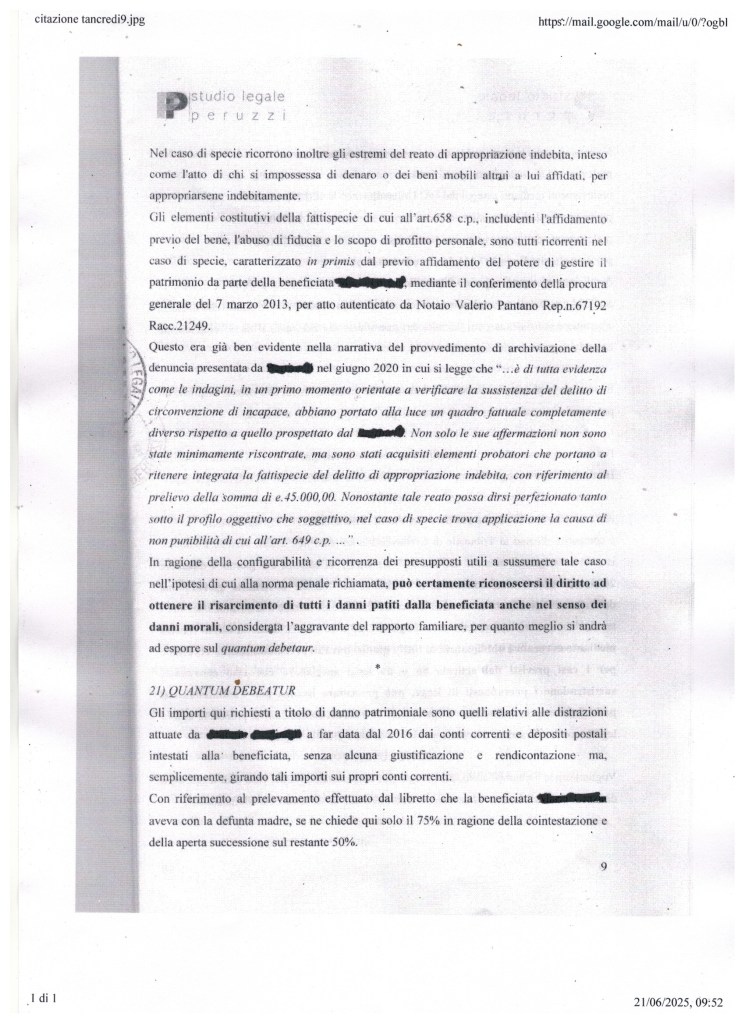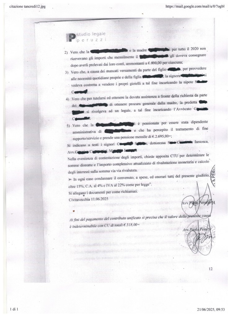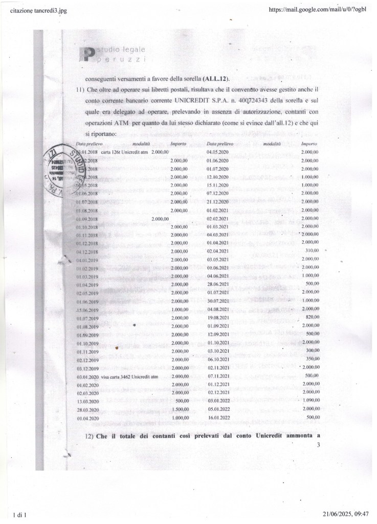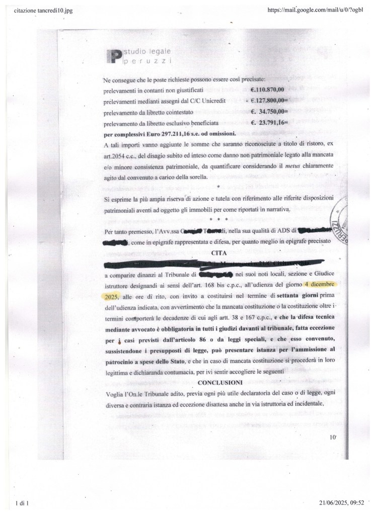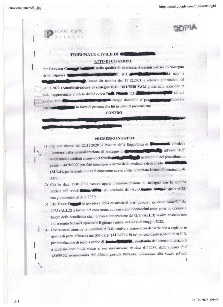 Il 20/6/2025 il nostro amico ha ricevuto un atto di citazione per appropriazione indebita da parte dell’AdS della sorella (SEMPRE IN CARICA !!! Malgrado le denunce esaurientemente documentate al giudice tutelare, alla procura della Repubblica competente, a quella di Perugia e al CSM).