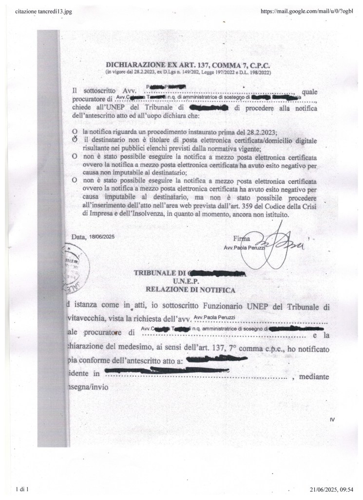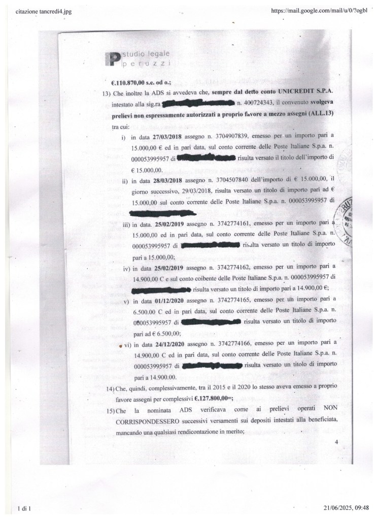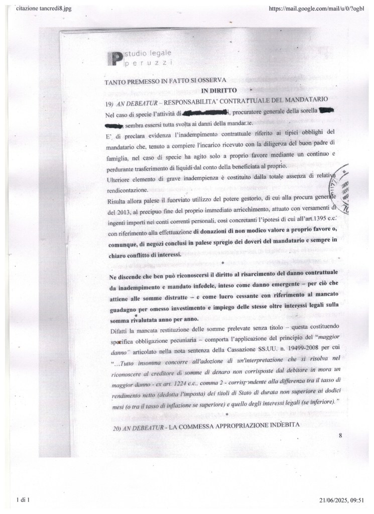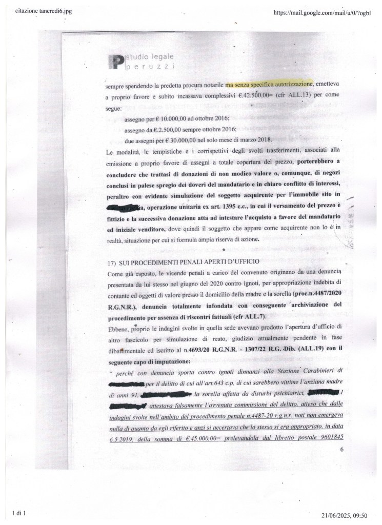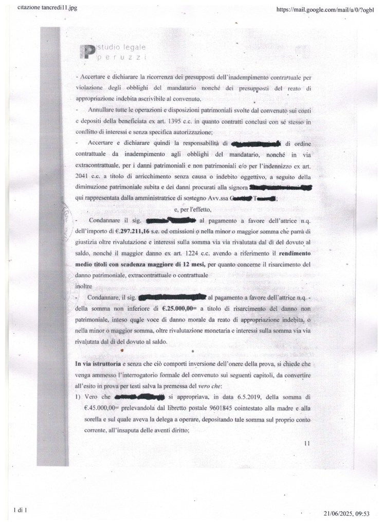 Il 20/6/2025 il nostro amico ha ricevuto un atto di citazione per appropriazione indebita da parte dell’AdS della sorella (SEMPRE IN CARICA !!! Malgrado le denunce esaurientemente documentate al giudice tutelare, alla procura della Repubblica competente, a quella di Perugia e al CSM).