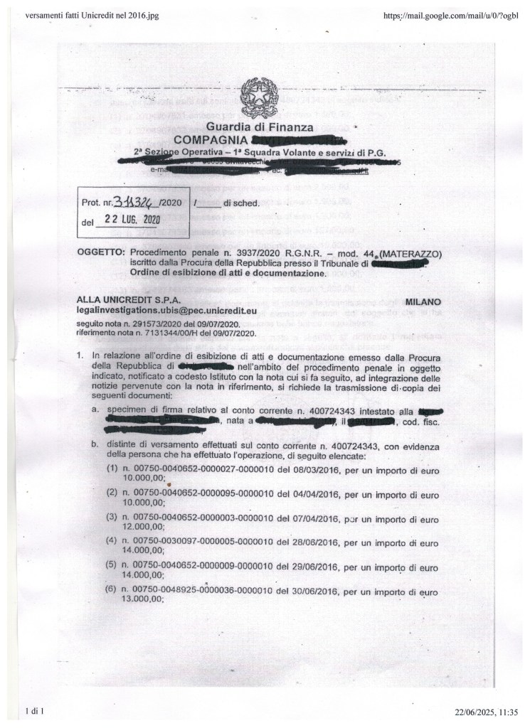 L’indagine della Finanza sulle movimentazioni di denaro familiari copre un arco temporale più ampio di quello preso in considerazione, però all’attore non è utile far apparire che l’accusato, nel corso del 2016, ha versato sul conto corrente della sorella 73000 euro. Allora è meglio non farlo sapere. All’uopo provvederemo noi con una fotocopia.