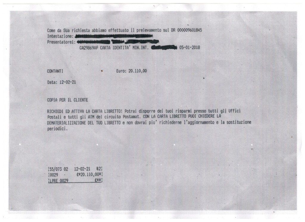 Dopo l’ingresso che la magistratura ha fatto nella sua vita, la sorella del nostro amico non ha fatto altro che peggiorare. Anche la memoria della donna non è più affidabile. Tra le tante cose che non ricorda più ci sono pure i prelievi bancari e postali che faceva personalmente. Si da il caso che questo giochi a favore dei “benefattori” benvoluti dal tribunale. A titolo di esempio riportiamo il riscontro di un prelievo che l’amministrata fece personalmente il 12/2/2021. L’AdS della sorella del protagonista della cronaca che teniamo da cinque anni, avvocato che in quelle aule si muove agevolmente, però ha denunciato calunniosamente l’uomo, scrivendo alla procura della Repubblica che l’operazione era stata fatta da lui.
