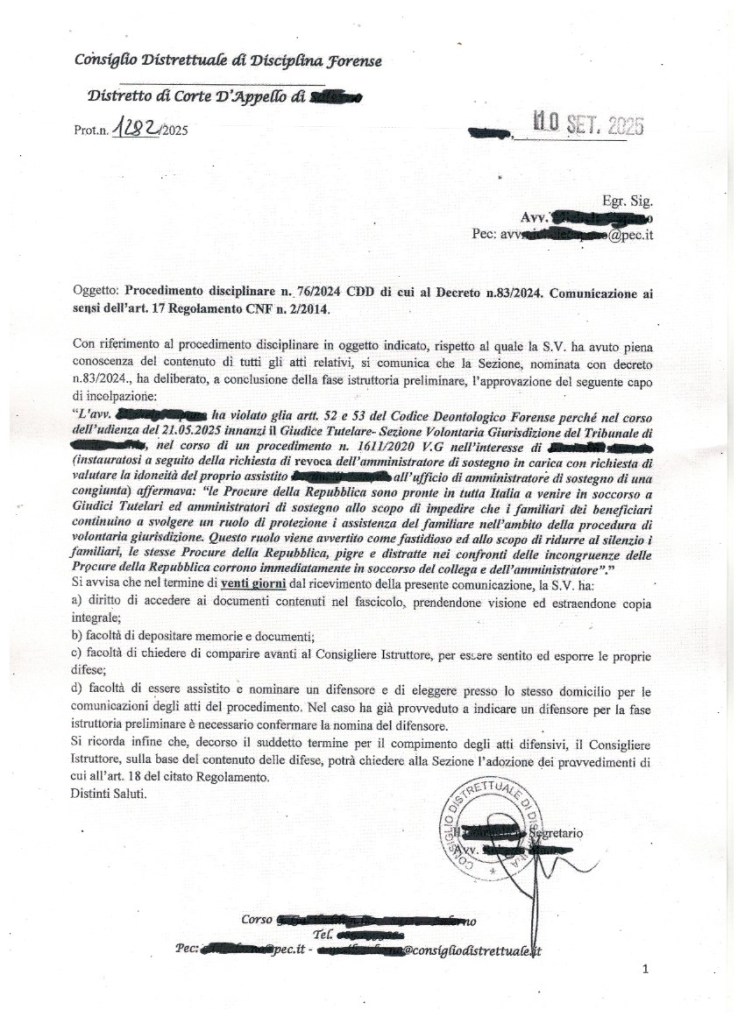 Per sottolineare ancora una volta quanto sia accidentato il percorso giudiziario di quelli che sono costretti a lottare contro gli arbitri consentiti dall’applicazione-interpretazione della legge n. 6/2004 forniamo la copia di un documento. Una gran parte di familiari dei “beneficiati” giudiziari, travolta da questa legge criminogena, ha sperimentato l’attacco calunnioso dei “benefattori” esogeni scelti dai tribunali e l’attacco personale tramite l’impiego del codice penale. Dal documento qui fornito si capisce cosa accade a chi lo dichiara apertamente.